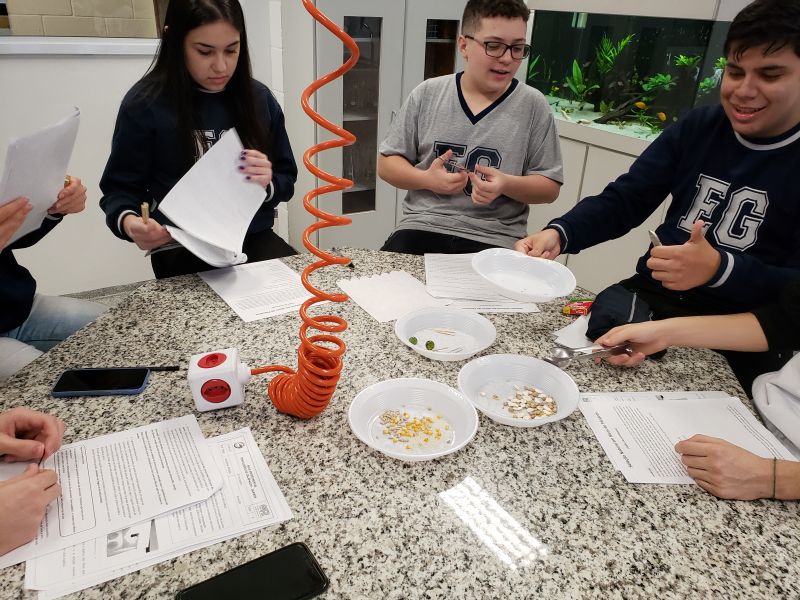 No laboratório, os alunos simularam a viagem que Darwin fez às ilhas Galápagos e, com objetos do dia a dia, representaram os bicos dos tentilhões. Durante a aula, os alunos compreenderam o conceito de seleção natural e foram indagados pelo professor sobre o porquê de a teoria evolucionista de Darwin se sobrepor à teoria de Lamark.