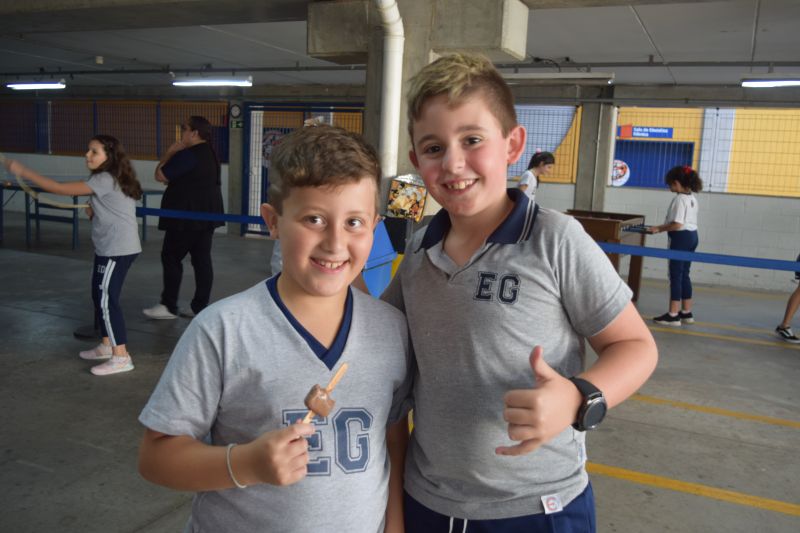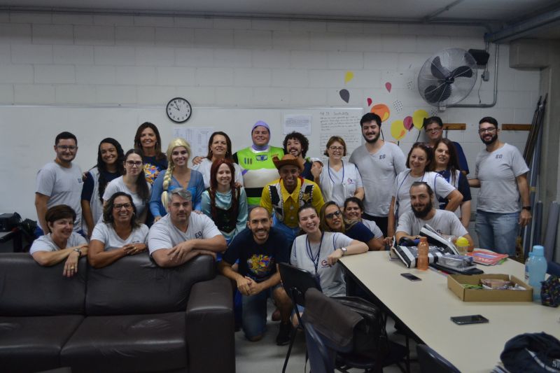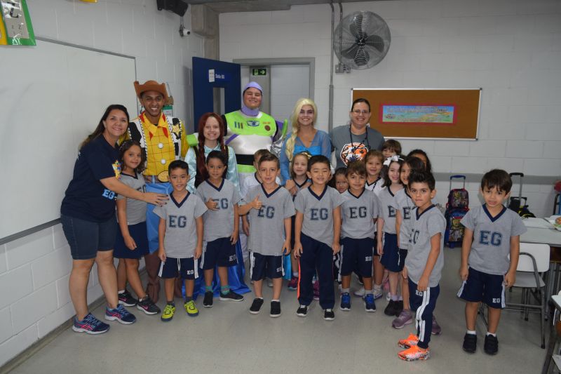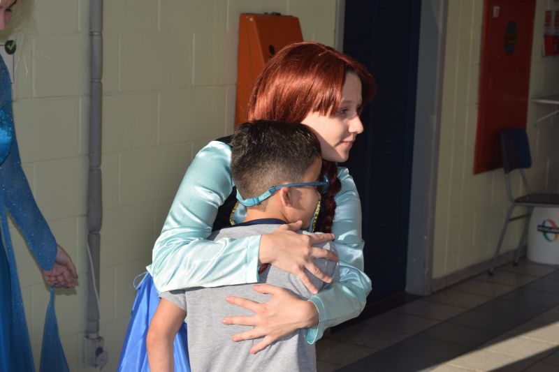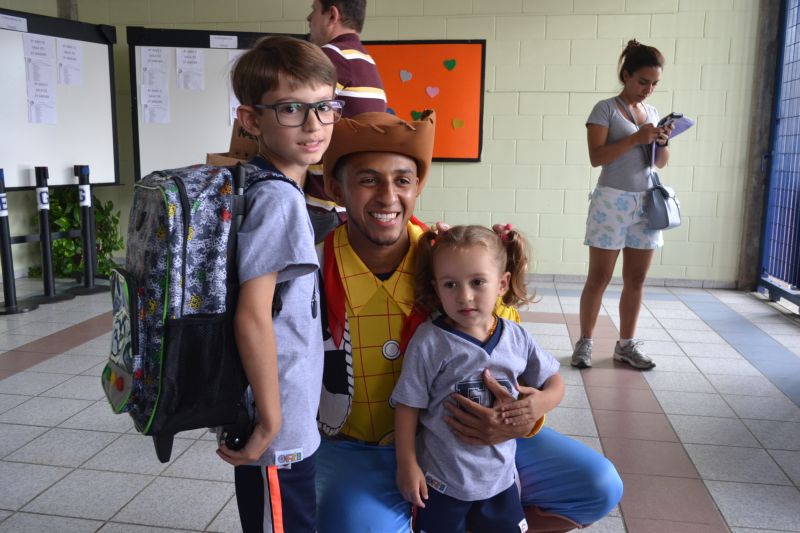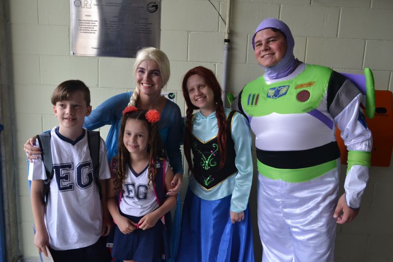 Foram recepcionados pelos professores do Departamento de Esporte e Cultura, fantasiados de personagens famosos, e, na hora do intervalo, receberam picolés.
