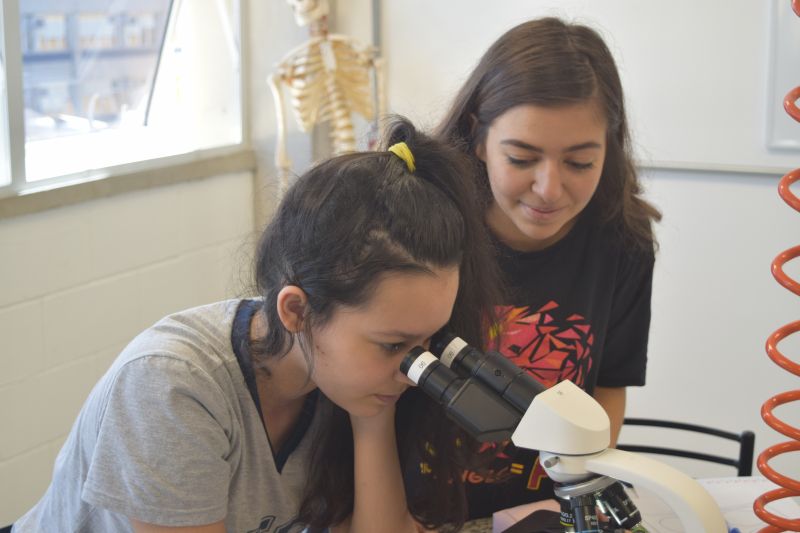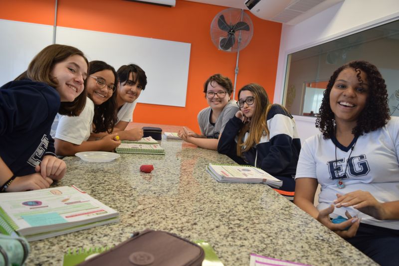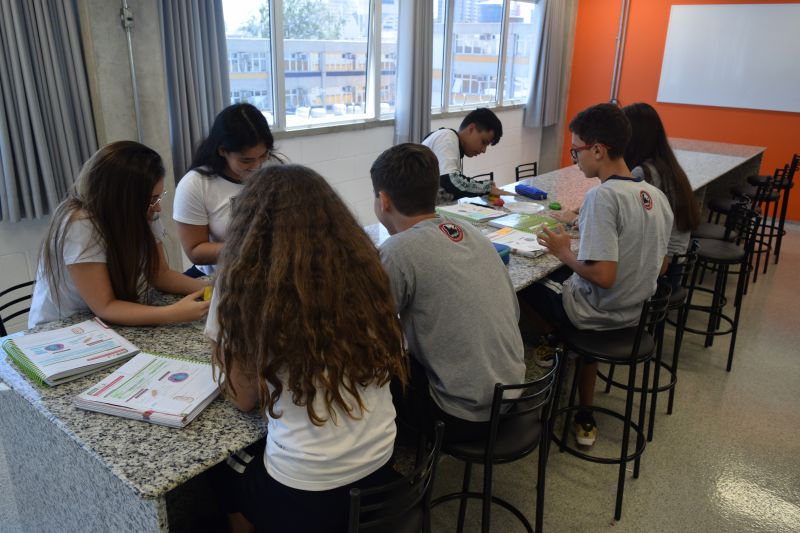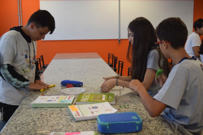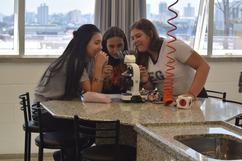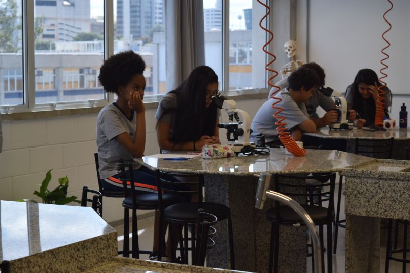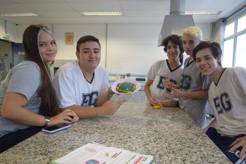 Na Cozinha, os estudantes fizeram uma massinha de receita caseira e, com ela, montaram células procariontes e eucariontes. Já no laboratório, dividiram-se em grupos e observaram, ao microscópio, diversas lâminas citológicas, como de: neurônios, pulmão, intestino delgado, osso denso, epiderme de cebola etc.