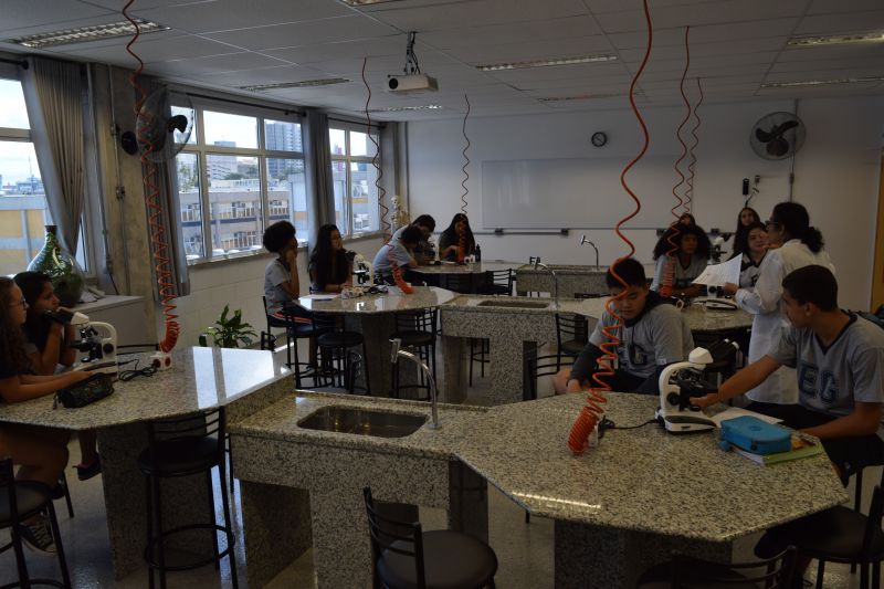 Com o objetivo de aprimorar os conhecimentos acerca do Reino Monera e mostrar as partes de um microscópio óptico, a Profª Valquiria Nunes, de Biologia, levou os estudantes da 1ª série do Ensino Médio ao Laboratório de Ciências e à Cozinha Experimental.