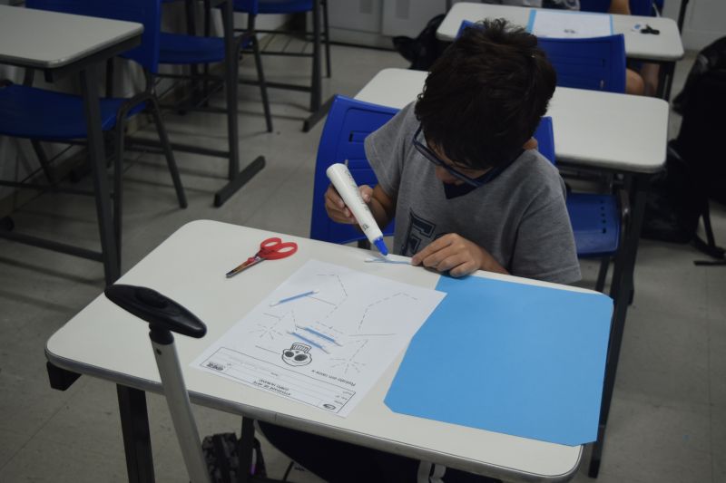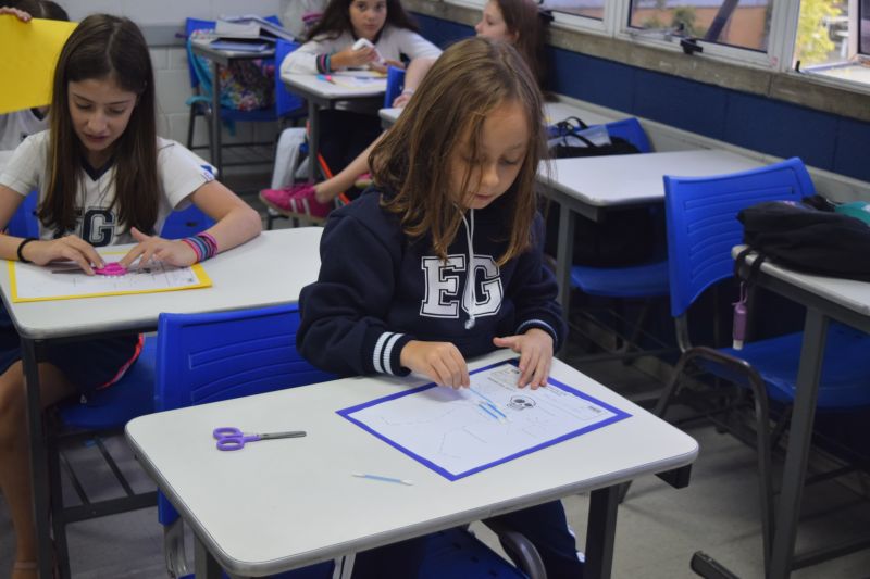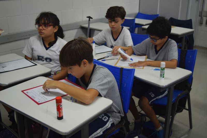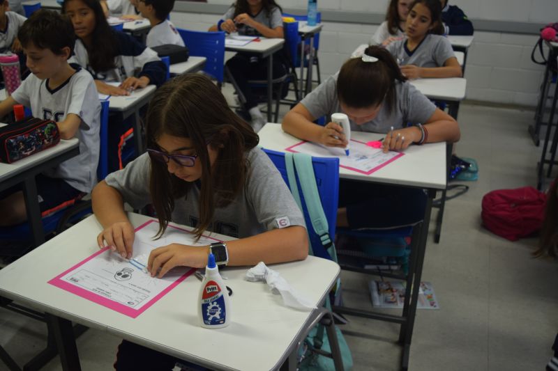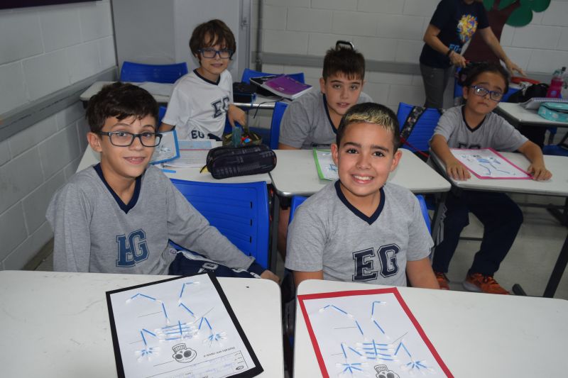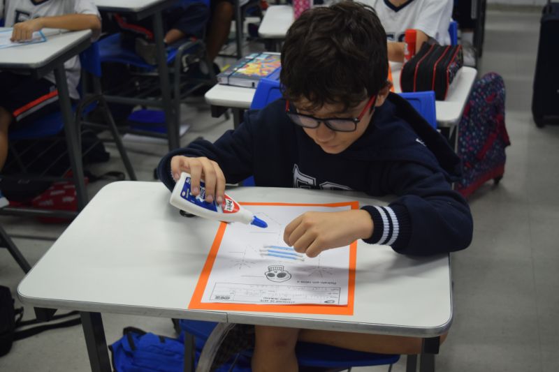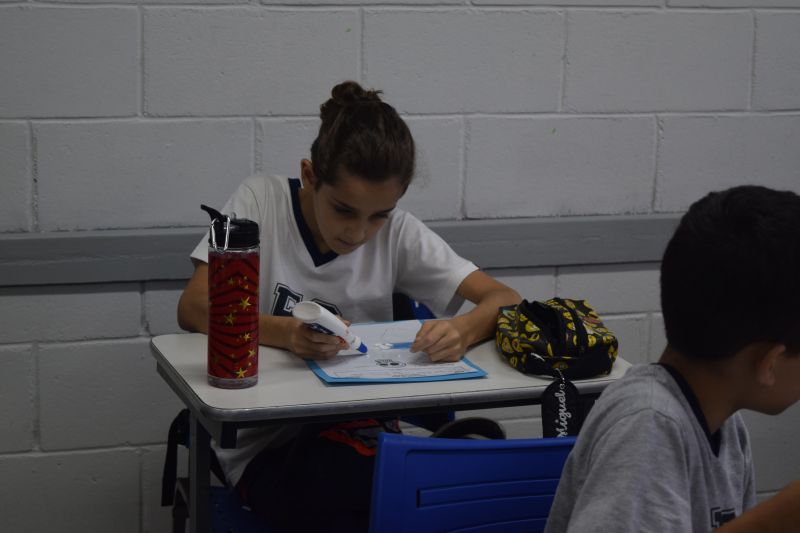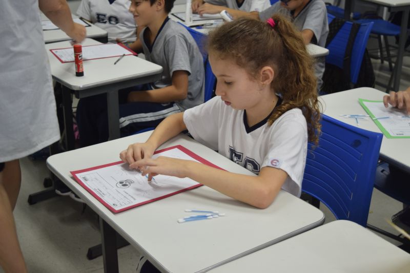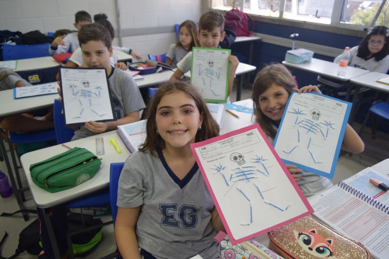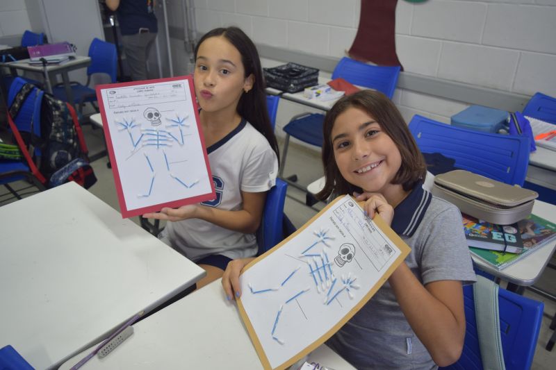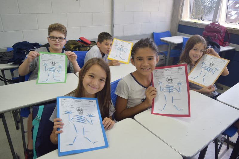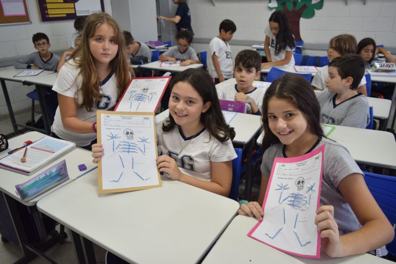 No mês de março, estudantes do 5º ano do Ensino Fundamental, orientados pela Prof.ª Vitoria Perricci, de Arte, confeccionaram esqueletos humanos com cotonetes.
