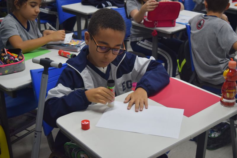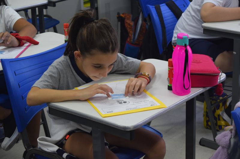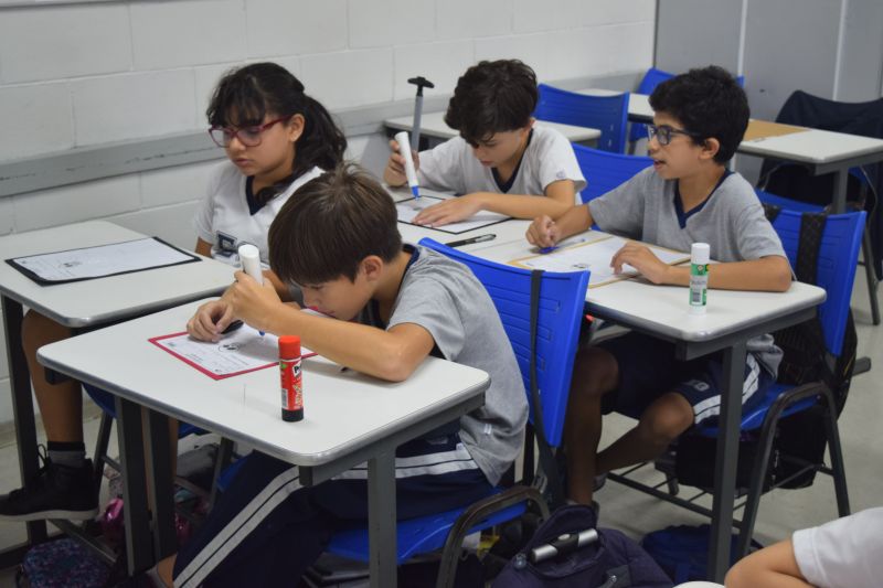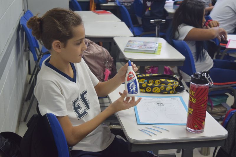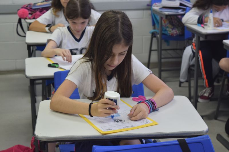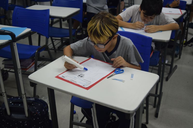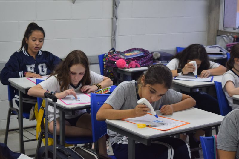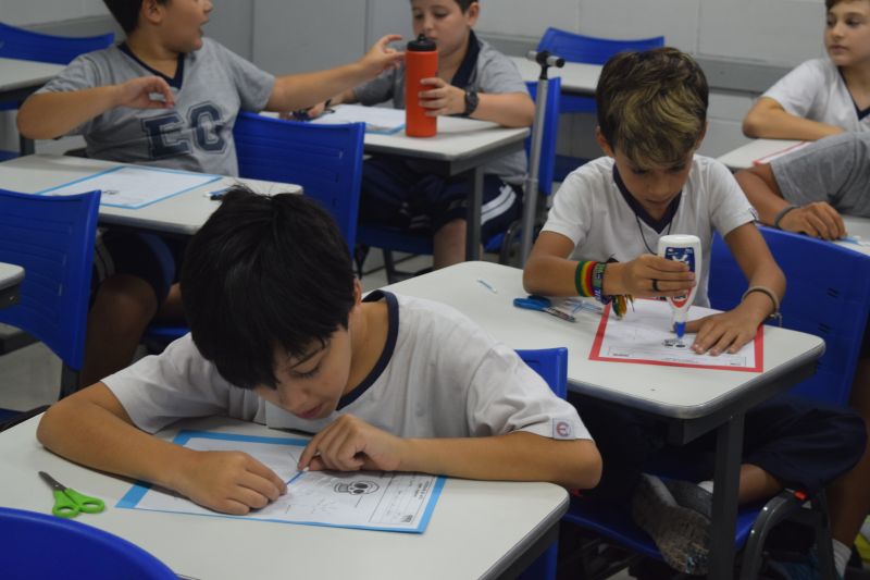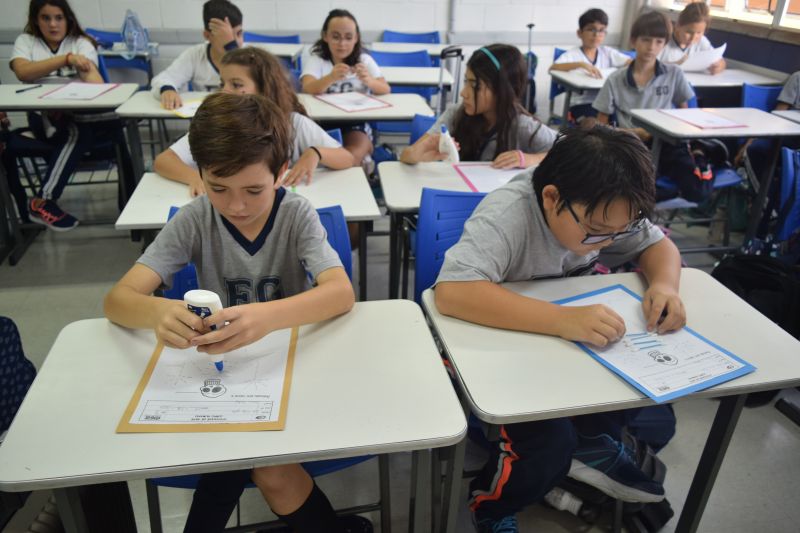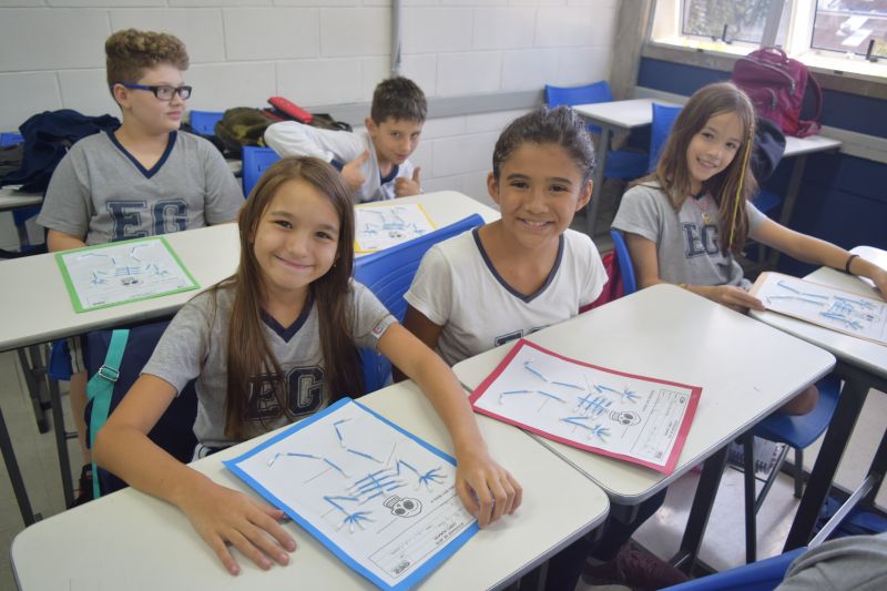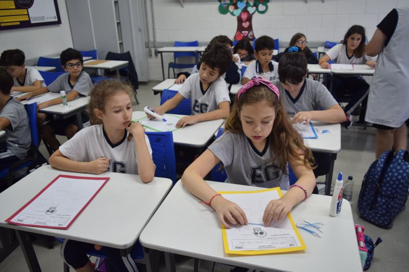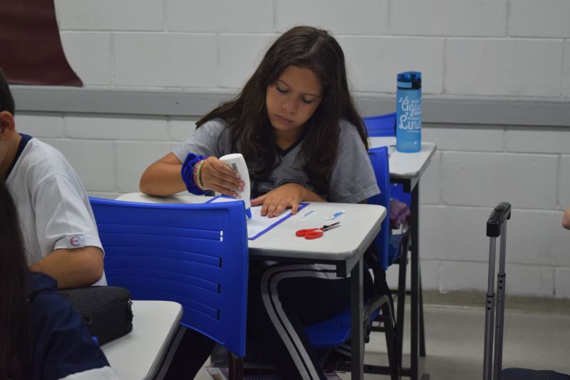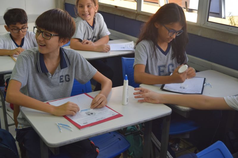 No mês de março, estudantes do 5º ano do Ensino Fundamental, orientados pela Prof.ª Vitoria Perricci, de Arte, confeccionaram esqueletos humanos com cotonetes.
