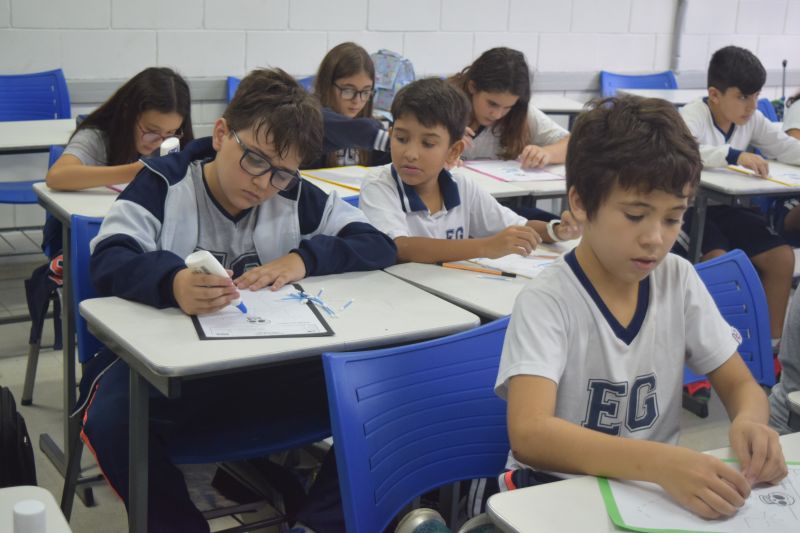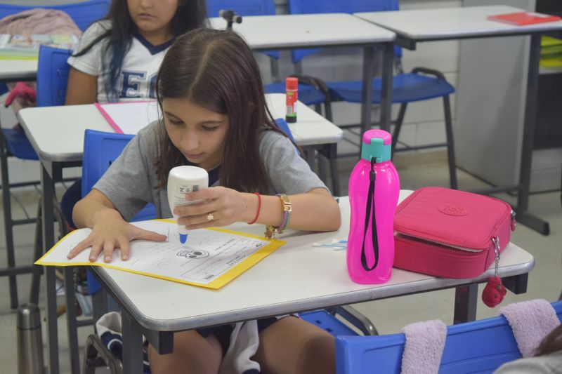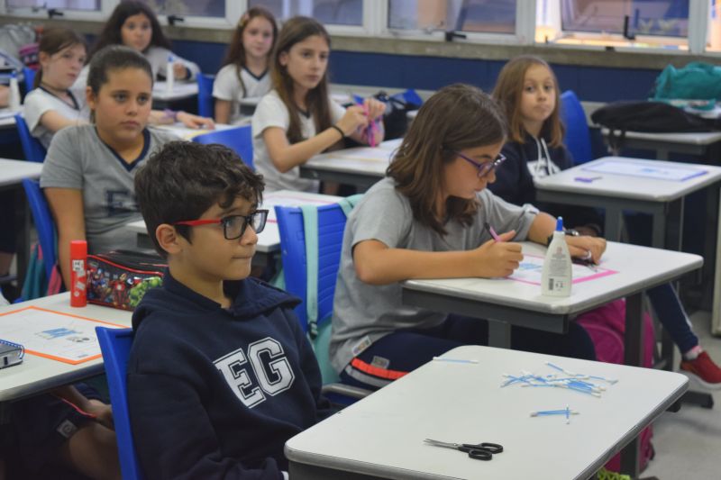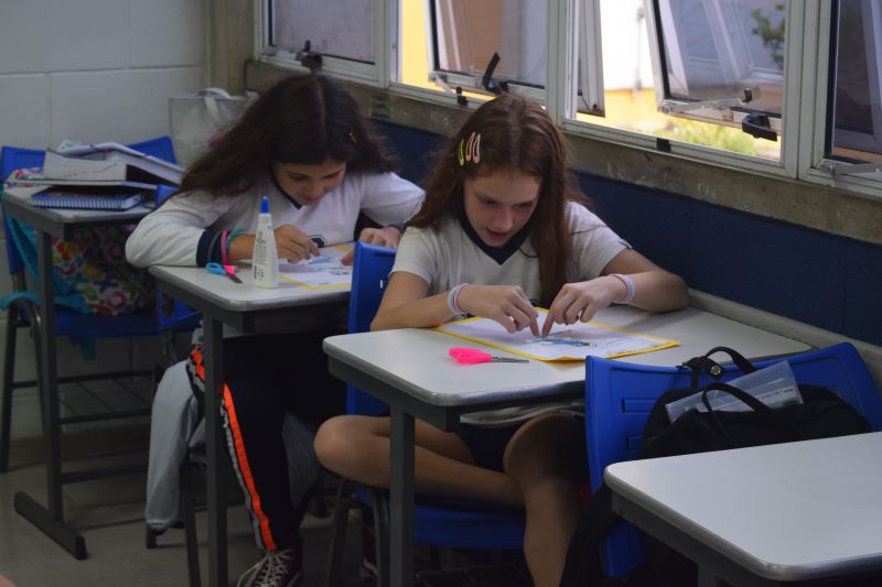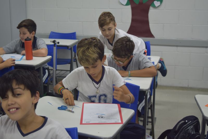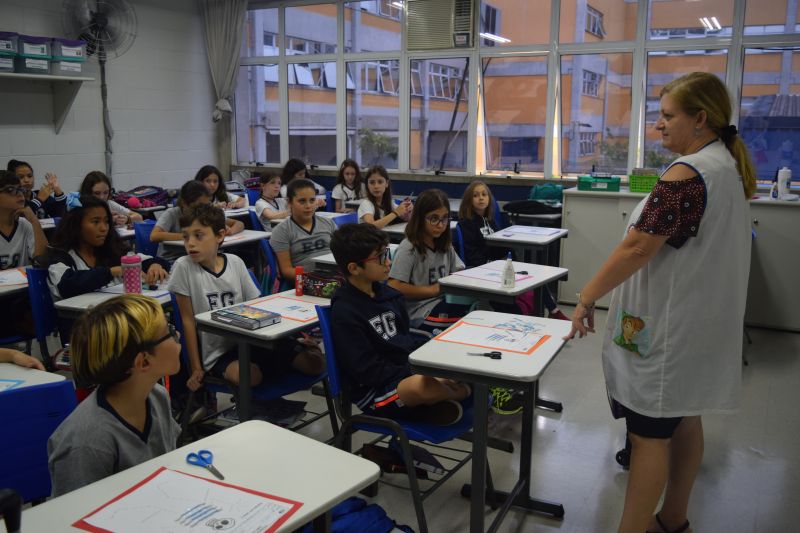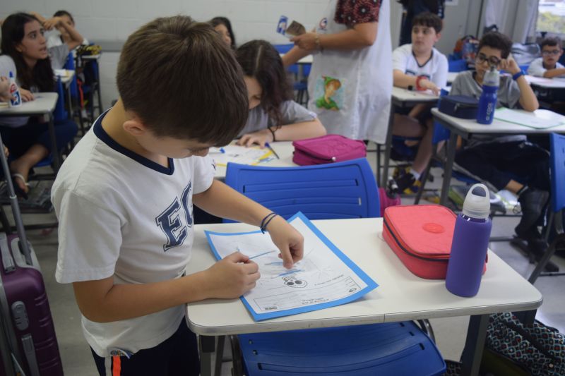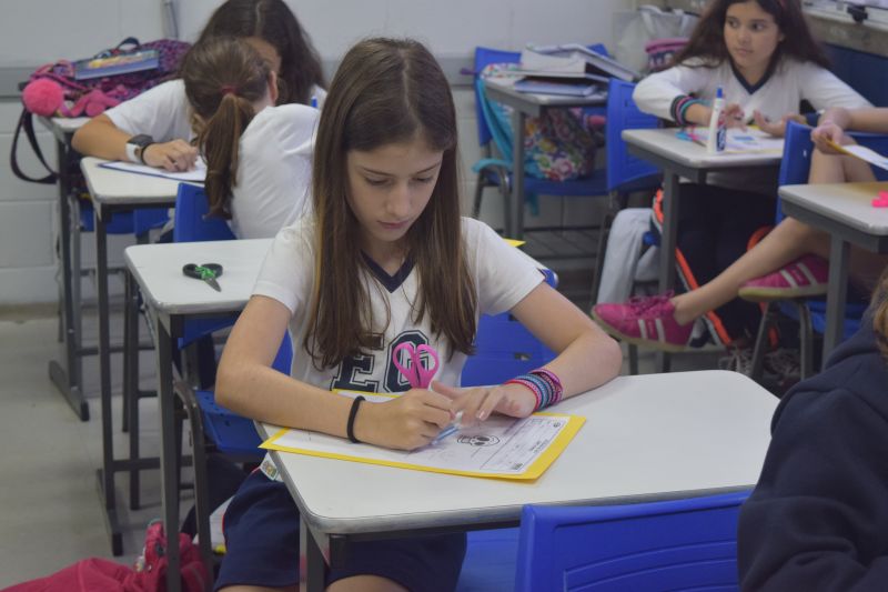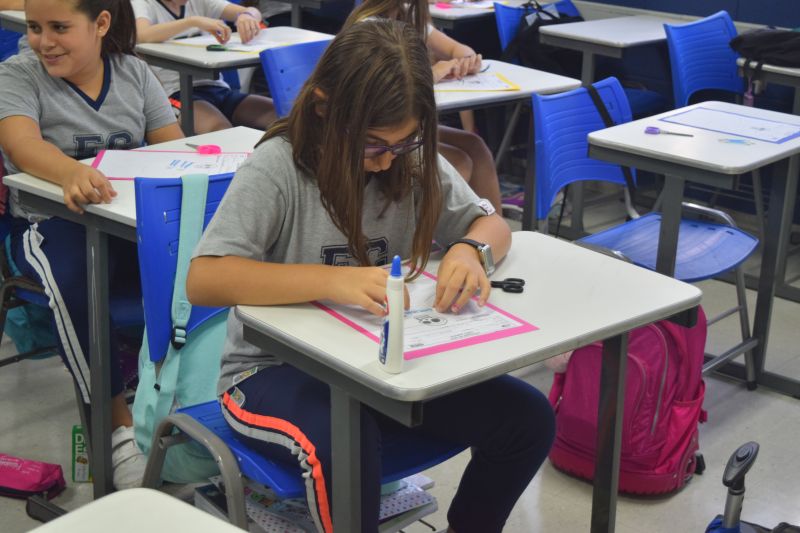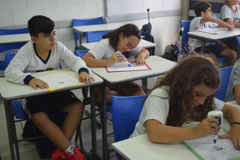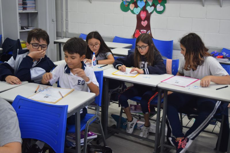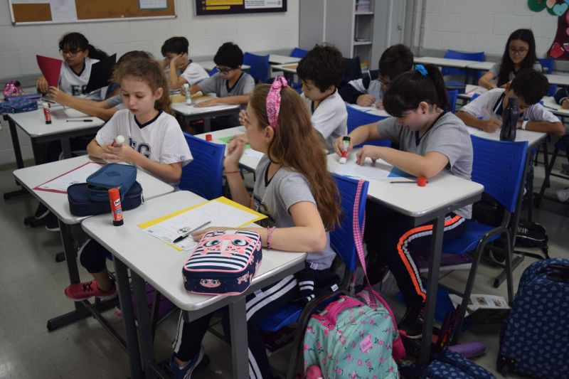 No mês de março, estudantes do 5º ano do Ensino Fundamental, orientados pela Prof.ª Vitoria Perricci, de Arte, confeccionaram esqueletos humanos com cotonetes.
