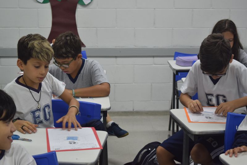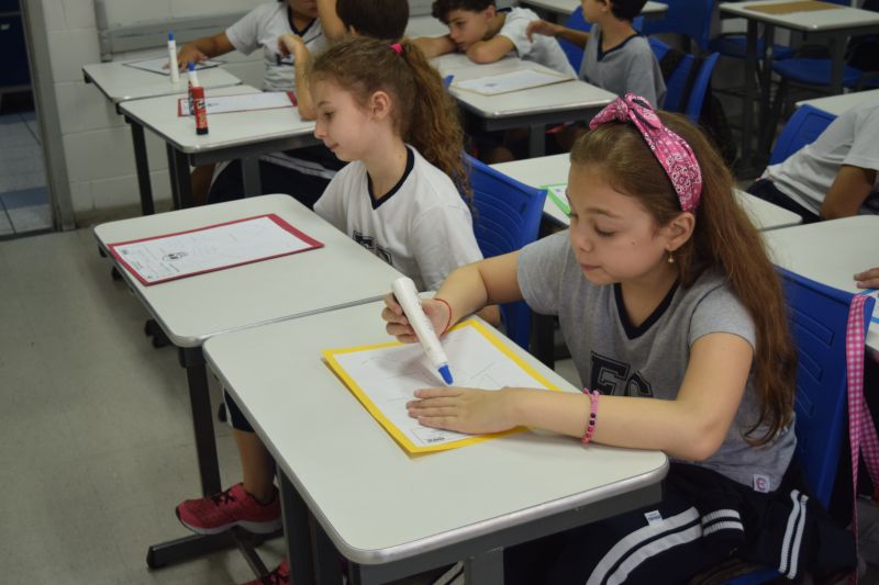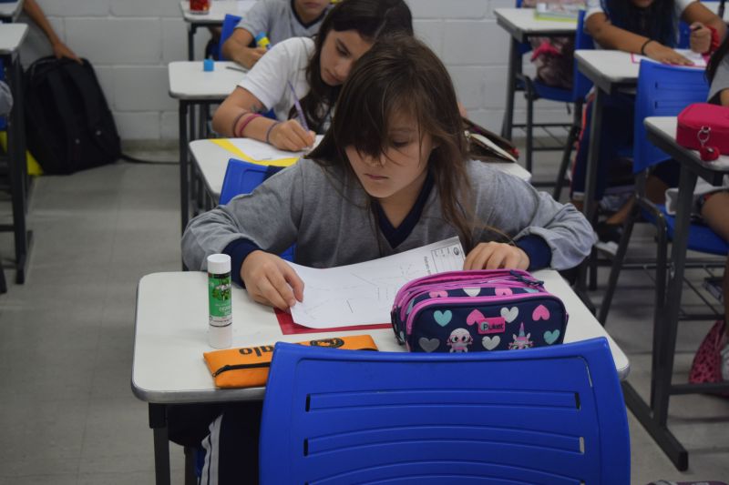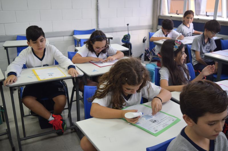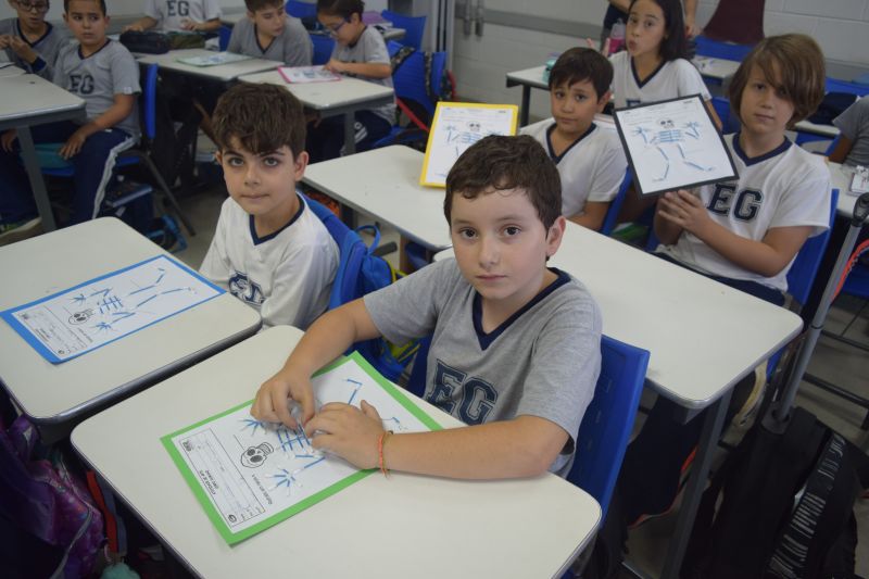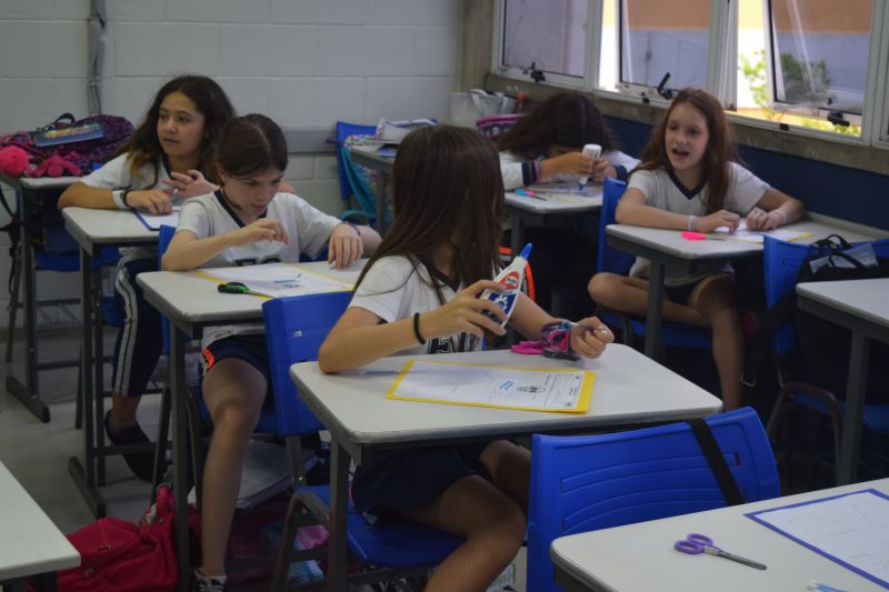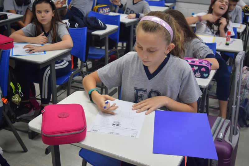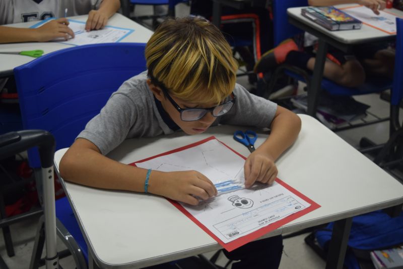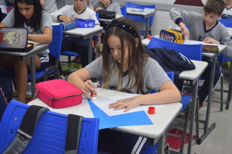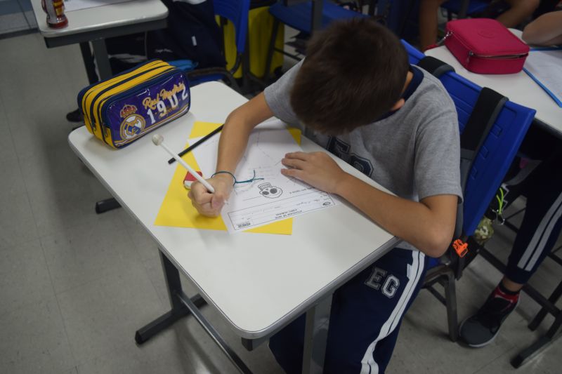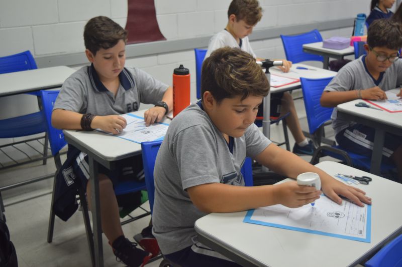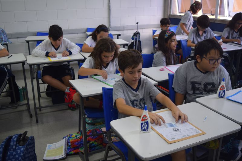 No mês de março, estudantes do 5º ano do Ensino Fundamental, orientados pela Prof.ª Vitoria Perricci, de Arte, confeccionaram esqueletos humanos com cotonetes.
