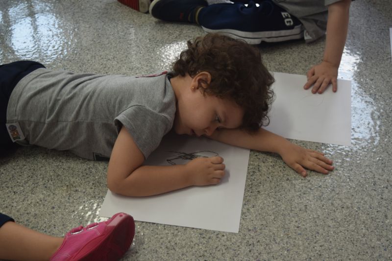 Ao chegarem lá, os estudantes viram, com óculos 3D, um pequeno vídeo em que um lobo apareceu. Logo depois, a professora distribui giz de cera e papel sulfite para que todos desenhassem o lobo que tinham visto!