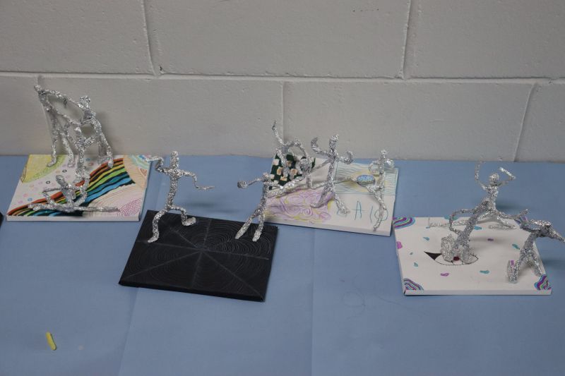 A atividade foi realizada em grupo, utilizando, como referência/inspiração, o artista Alberto Giacometti. Nesse projeto, os estudantes tiveram de produzir esculturas em papel alumínio, explorando principalmente os movimentos.