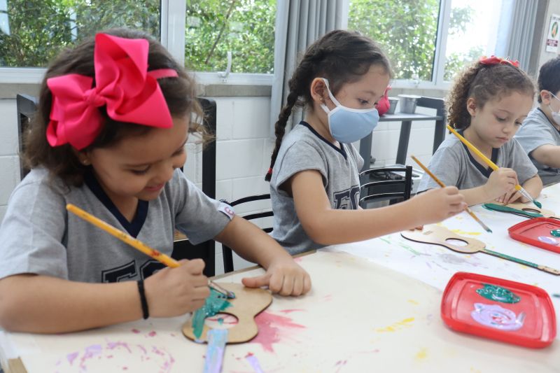 No Espaço Maker, cada estudante recebeu uma pequena viola de madeira e tintas coloridas para pintá-la e enfeitá-la de acordo com sua preferência. Depois, com o auxílio da Professora, amarraram barbante nas violas, para simular as cordas do instrumento.