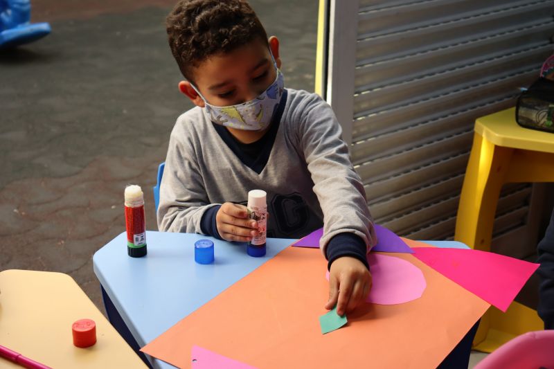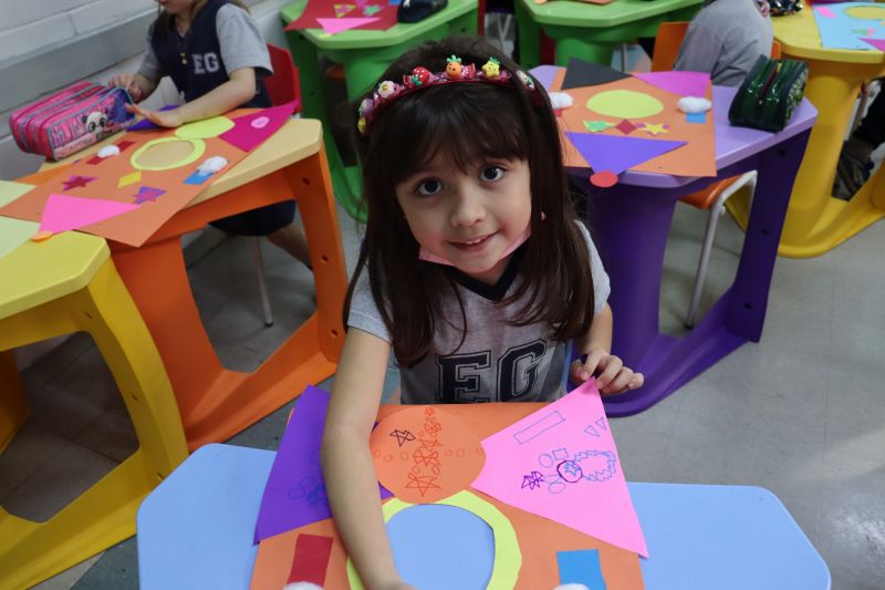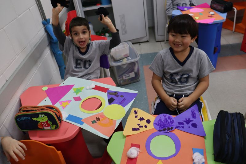 Cada um dos alunos construiu formas geométricas (shapes). Com os shapes prontos, os alunos montaram seu próprio jogo “Boca do Palhaço” (Clown’s Mouth), a partir dos comandos da professora, em inglês, exercitando a escuta (listening) e também a fala (speaking), de maneira significativa.