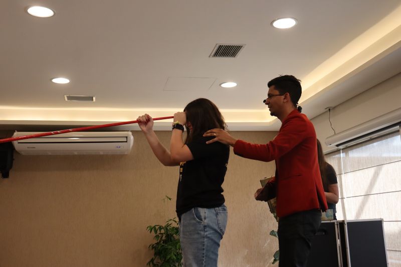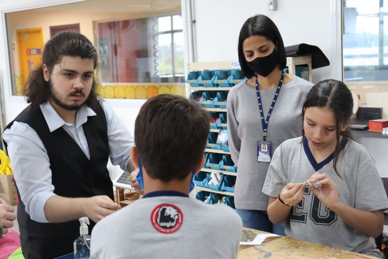 No Espaço Maker, os alunos participaram de um show de mágica e observaram diversas “mágicas científicas”, com frutas tocando notas musicais, espeto passando por um balão sem estourá-lo etc.