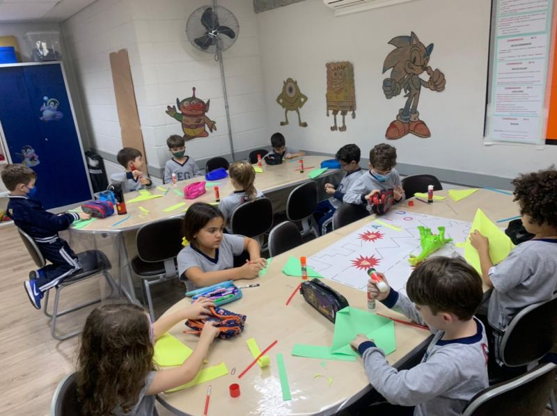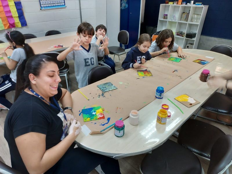 Para o aprimoramento das habilidades artísticas, vivenciaram a confecção de um jogo da velha, preparam massinha de modelar e slime e participaram de outras atividades, utilizando tintas, lápis de cor etc.