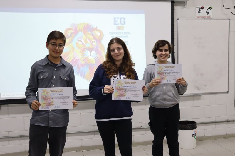 Na segunda quinzena do mês de setembro, o EG finalizou o processo de seleção de alunos para atribuição de bolsas de estudo para o Ensino Médio. Os alunos contemplados foram: Ana Rita Barontini Luksaitis, do 9º ano B; João Vítor Lima Balestra, do 9º ano C, ambos com 100% de bolsa, e Rafael Dessoti Romero, do 9º ano A, com 70%. Essas bolsas serão válidas para todo o Ensino Médio (da 1ª à 3ª série), de acordo com os critérios estabelecidos pelo EG, que são do conhecimento dos alunos e de suas famílias.