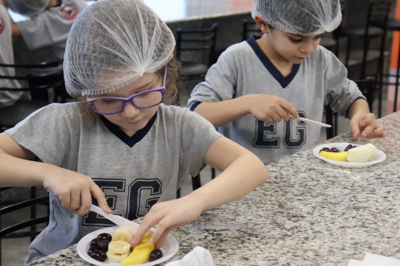 Cada aluno recebeu um pratinho com um pedaço de manga, um de banana e uma porção de uvas. Para incentivar a independência dos alunos, cada um cortou suas frutas, que foram juntadas para formar uma bela salada de frutas. Em seguida, degustaram o prato que ajudaram a preparar.
