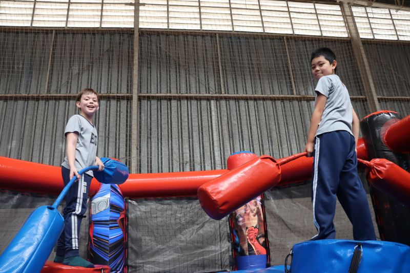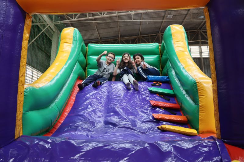 Na quadra poliesportiva, foram instalados brinquedos infláveis e touro mecânico. Durante todo o dia, em horários estabelecidos de acordo com a faixa etária dos estudantes, crianças e adolescentes brincaram e se divertiram com os colegas.