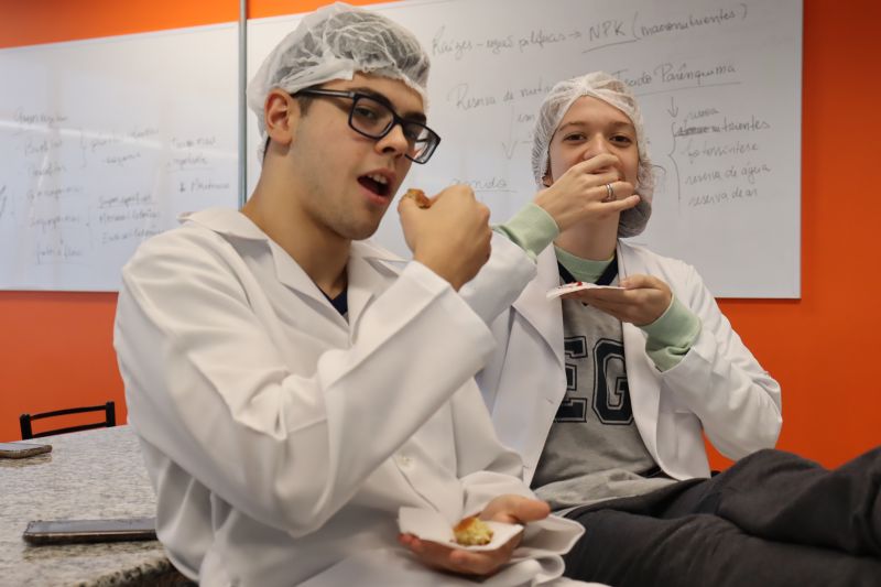 A atividade incluiu o preparo de bolos de beterraba, batata-doce, mandioca e cenoura, além da análise de como essas raízes modificam o sabor e a textura das massas. Para finalizar a atividade, os alunos degustaram os bolos.