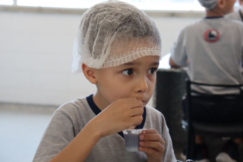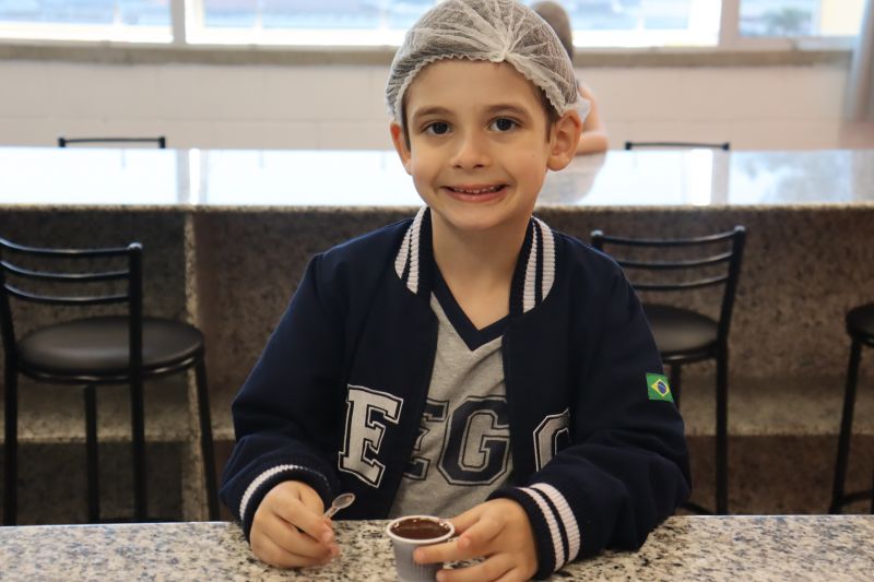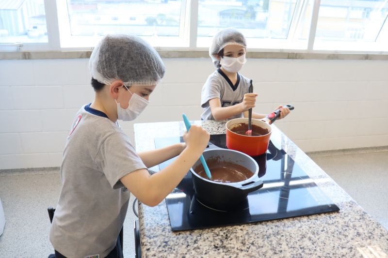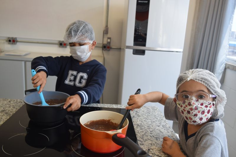 Em comemoração ao Dia das Crianças, os alunos do 1º ano do Ensino Fundamental foram à Cozinha Experimental com as Prof. as Valquíria, Bruna, Roberta e Eny para aprender a preparar a receita de brigadeiro e degustar o doce.