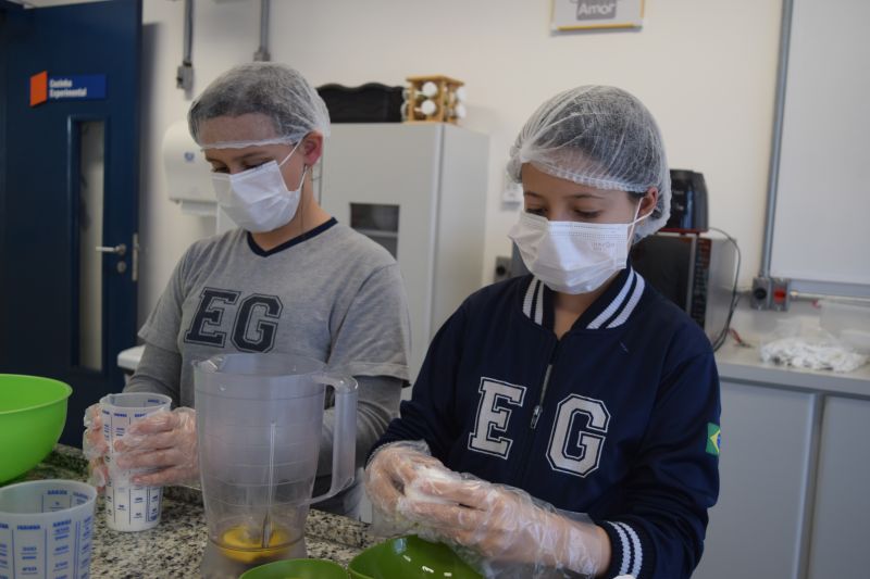 Dando continuidade às aulas sobre a temática Conhecendo os Nutrientes, os estudantes de 5º a 9º ano do EF – período integral, sob orientação da Thaisa (responsável pela Cozinha Experimental e pelo Laboratório), participaram do preparo de um bolo utilizando beterraba e batata-doce.