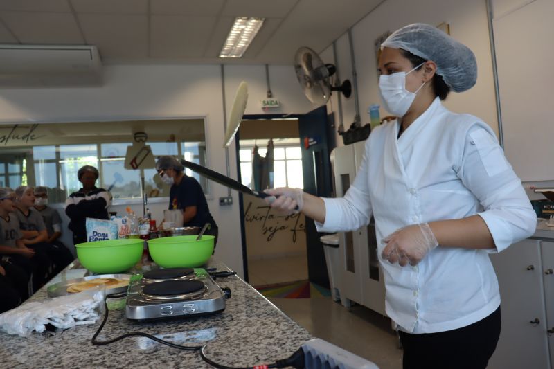 Na cozinha, além de relembrarem e ampliarem o vocabulário relacionado a alguns itens da alimentação, aprenderam verbos de comando (modo imperativo) encontrados em receitas culinárias.