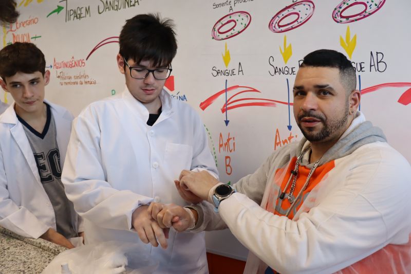 Os alunos da 1ª série do Ensino Médio, do Itinerário de Biologia, grupos 3,4 e 5, foram ao Laboratório e, sob orientação do Prof. Felipe Rodrigues Pius, realizaram testes de tipagem sanguínea.