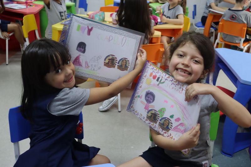 Nesse Projeto, um livro com páginas em branco foi confeccionado pelos alunos, que, livremente, foram inserindo recortes de imagens, desenhos, palavras e outros itens relacionados a momentos importantes de sua aprendizagem.