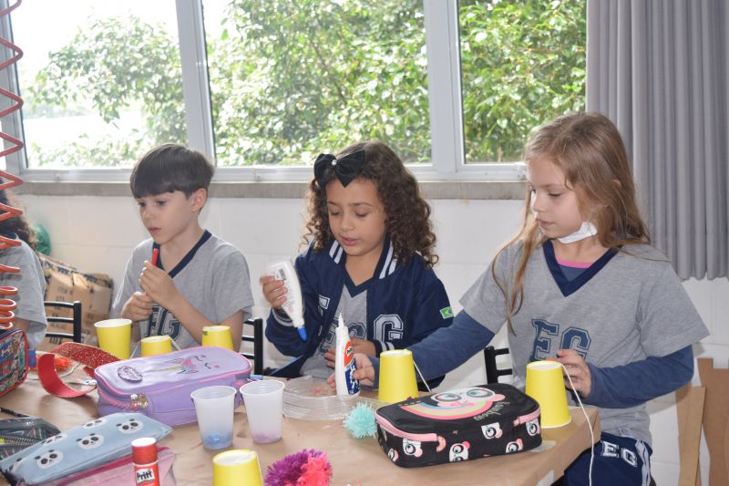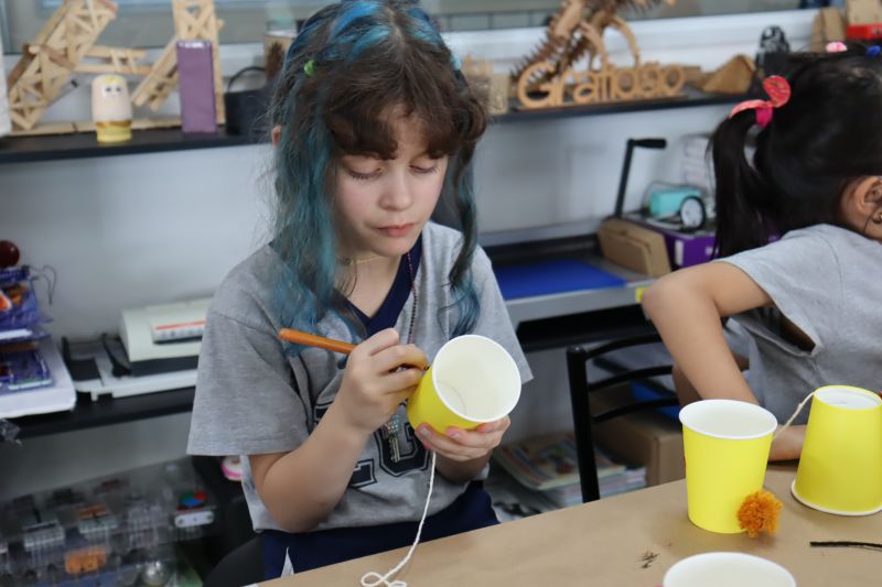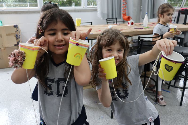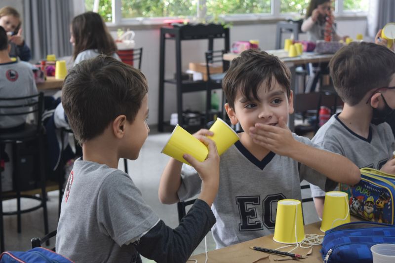 Os alunos do 1º ano do Ensino Fundamental foram ao Espaço Maker confeccionar um equipamento utilizado há anos nas brincadeiras infantis – o telefone sem fio.