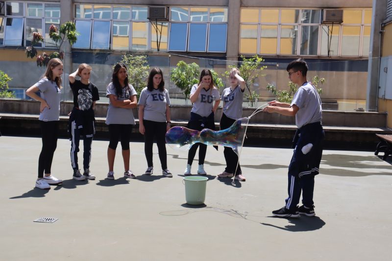 Os alunos do Itinerário de Biologia, da 1ª série EM, foram ao pátio para realizar uma atividade prática sobre propriedades da água, sob orientação do Prof. Felipe Pius.