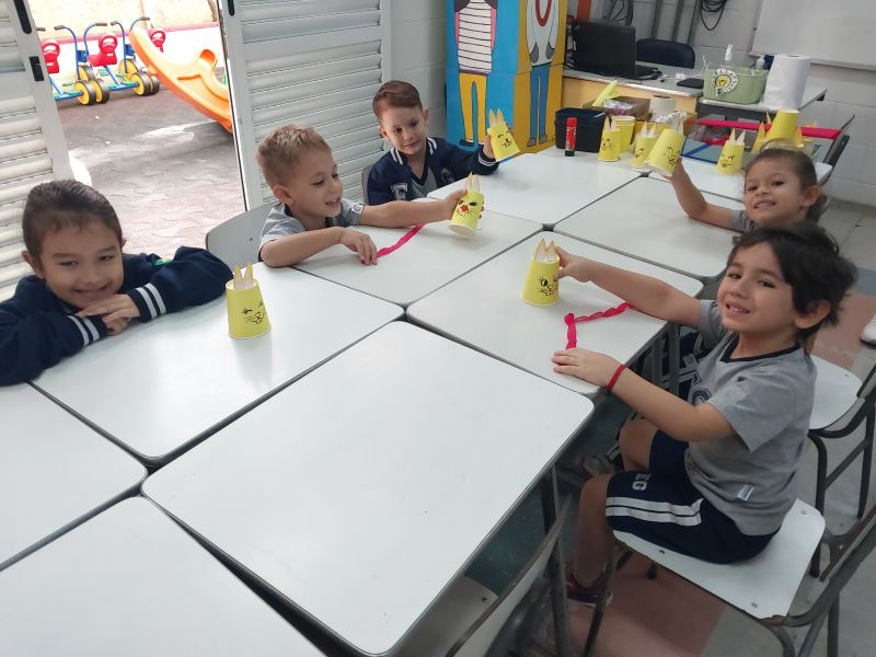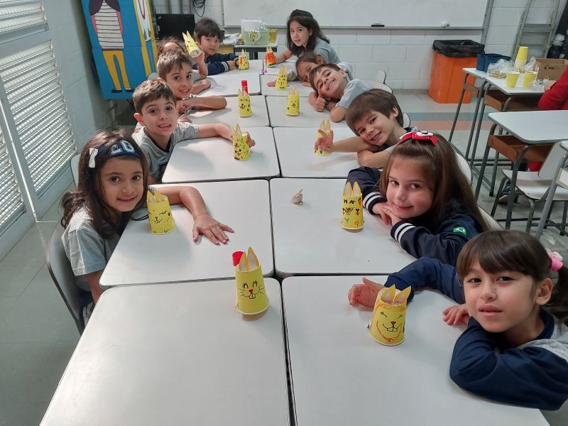 Para comemorar a Páscoa, a Prof.ª Erika Magalhães propôs aos alunos do período integral uma roda de conversa sobre o tema e a confecção de coelhinhos movidos a energia “elástica”.
