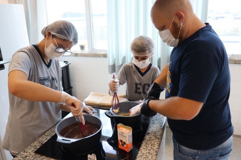 Na Cozinha Experimental, os estudantes auxiliaram no preparo da receita e degustaram o brigadeiro tradicional e o de maracujá. O objetivo da aula foi trabalhar a diversidade étnico-cultural no Brasil, assunto que estão estudando, em sala de aula, no módulo 5 do material Anglo, através da oficina de culinária.