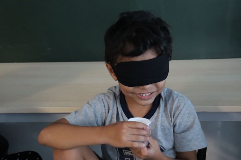 Na etapa seguinte, os alunos colocaram em prática o paladar. Selecionados aleatoriamente, experimentaram suco de limão, chá de boldo, bolacha de água e sal e chocolate, divertindo-se ao decifrar cada sabor, identificando se era amargo, azedo, doce ou salgado.