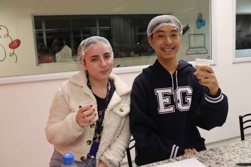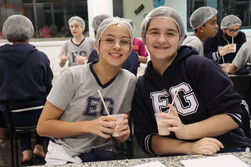 Já com o 9º ano, os teachers, além de contarem a história da bebida, demonstraram a execução da receita e, em seguida, os estudantes praticaram, em grupos, minidiálogos relacionados a oferecer, aceitar e recusar a bebida, empregando as expressões necessárias para isso e, ao final, também degustaram o milk shake.