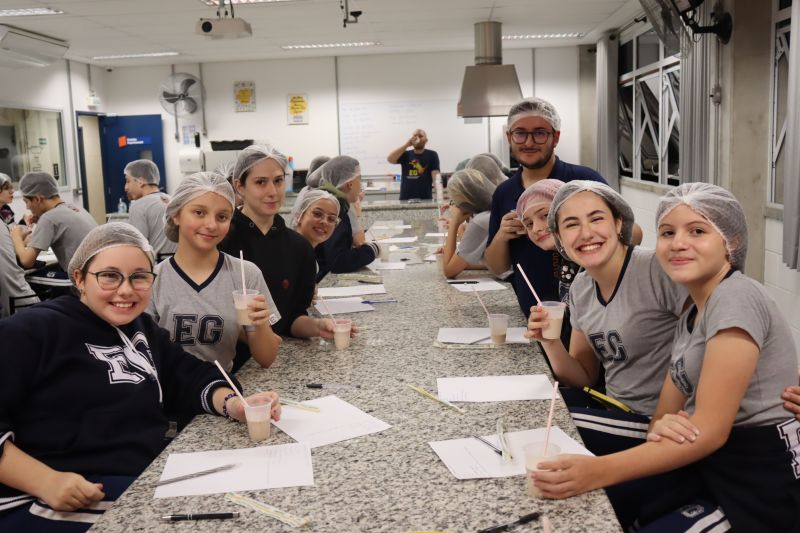 Os alunos de 8º e 9º anos foram à cozinha experimental para entrar em contato com um elemento da culinária estadunidense: o milk-shake, orientados pelo Prof. Henrique Barbosa e pelas Prof. as Angélica de Freitas, Andrea Almeida, Lilian Braz e Renata Asano, além do Prof. Carlos (responsável pela cozinha e pelo laboratório).