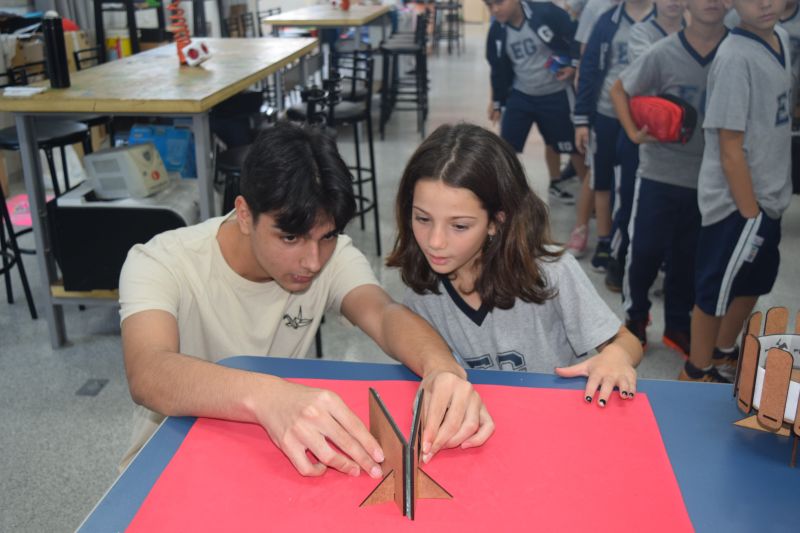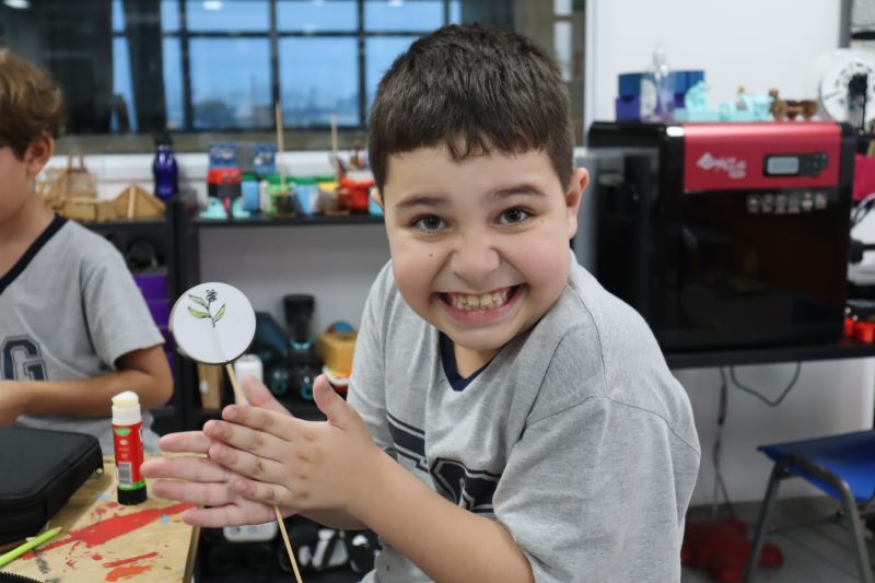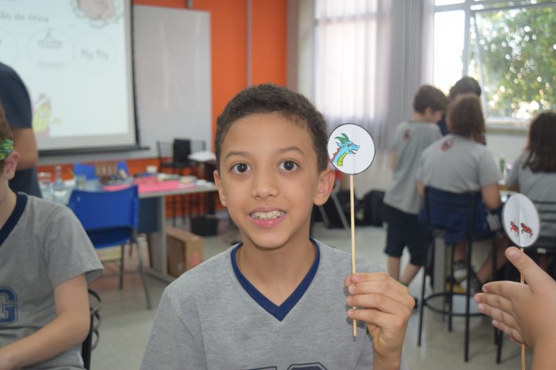 Os estudantes do 3º ano EF foram ao Espaço Maker para construir um taumatrópio, um brinquedo que provoca a junção de duas figuras distintas, dando a impressão de que elas estão no mesmo plano, unidas. Para a construção, utilizaram palito de churrasco e um disco de papel, com uma imagem diferente de cada lado.