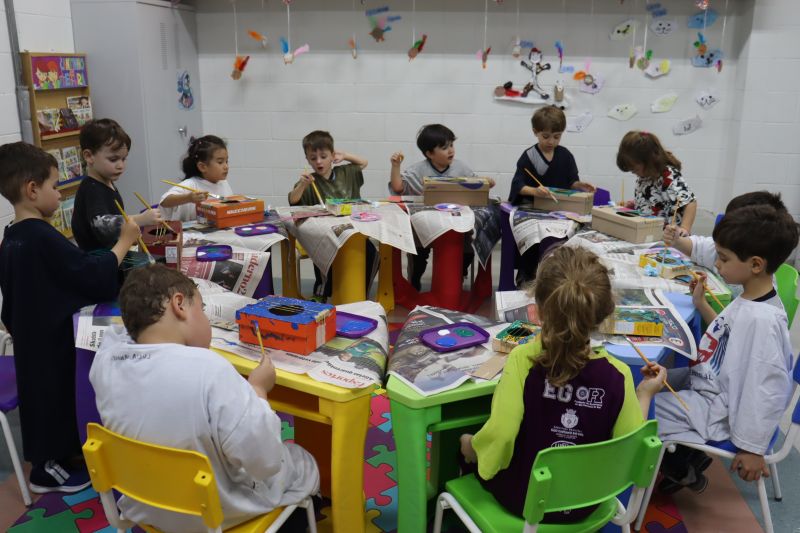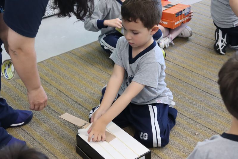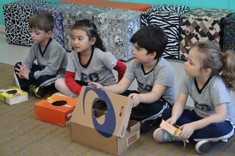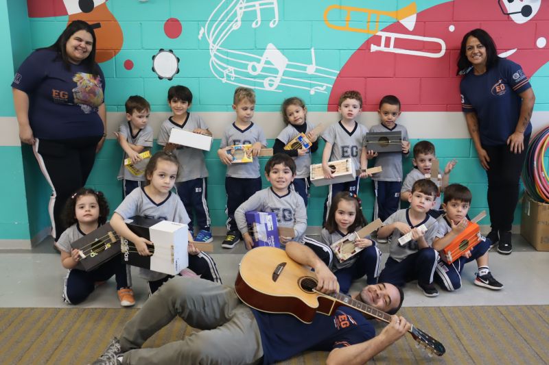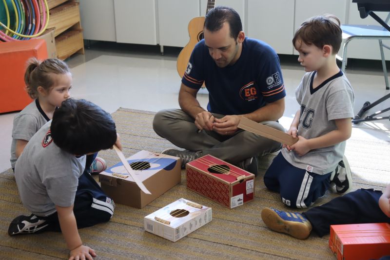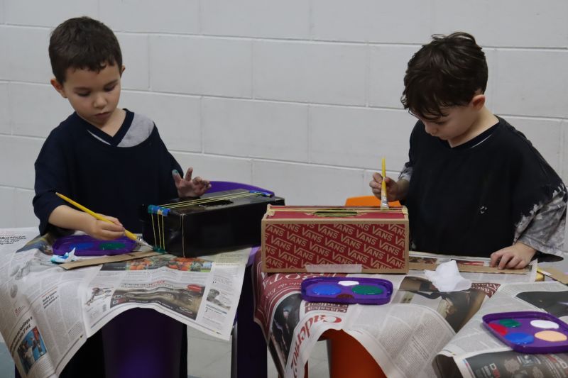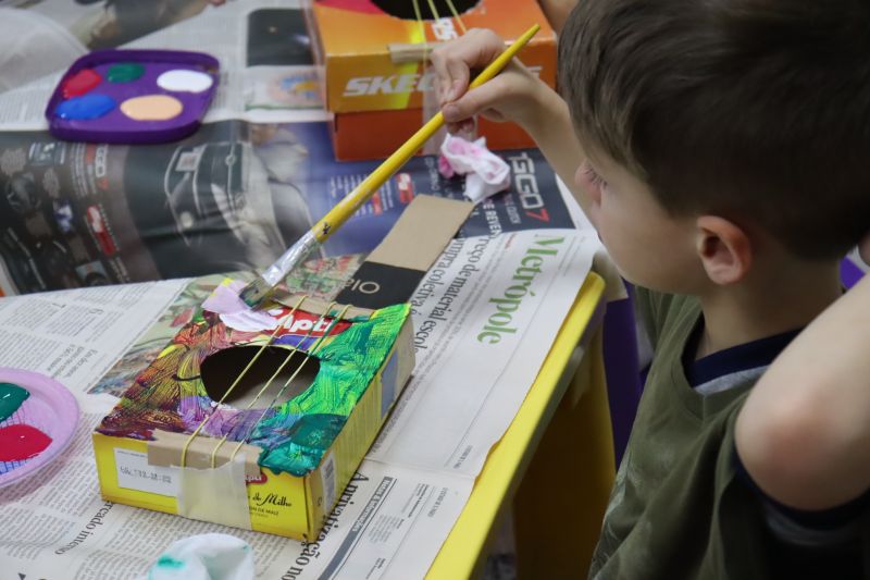 Durante a realização da atividade, os alunos confeccionaram uma viola com materiais recicláveis e, com ela, reconheceram as qualidades do som (intensidade, duração, altura e timbre). Em seguida, expressaram sua criatividade por meio de pintura e colagem em suas violas.