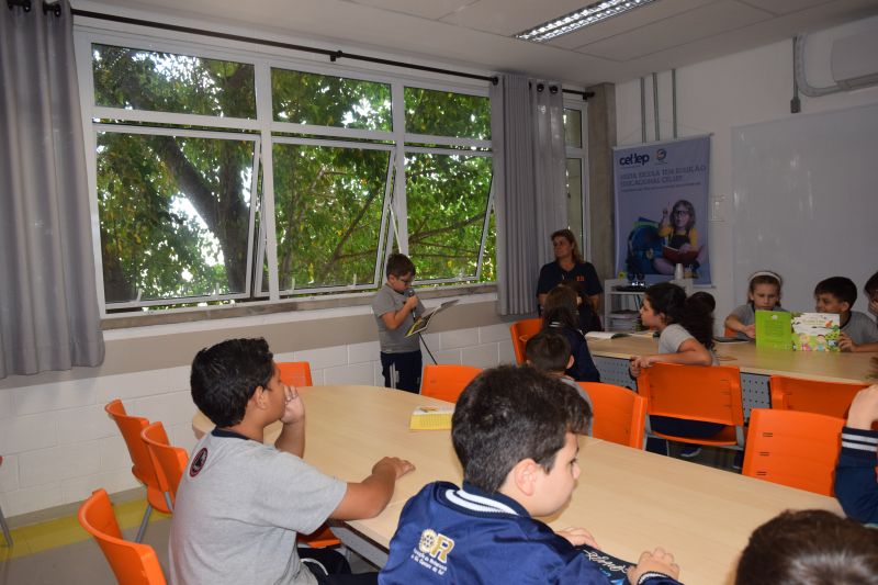 Os estudantes do 4º ano EF, orientados pela Professora Adriana, foram até uma sala ambiente, próxima à Biblioteca do EG para uma das atividades que integram o Projeto Roda de Leitura.