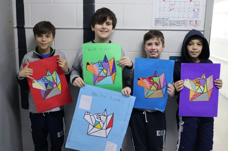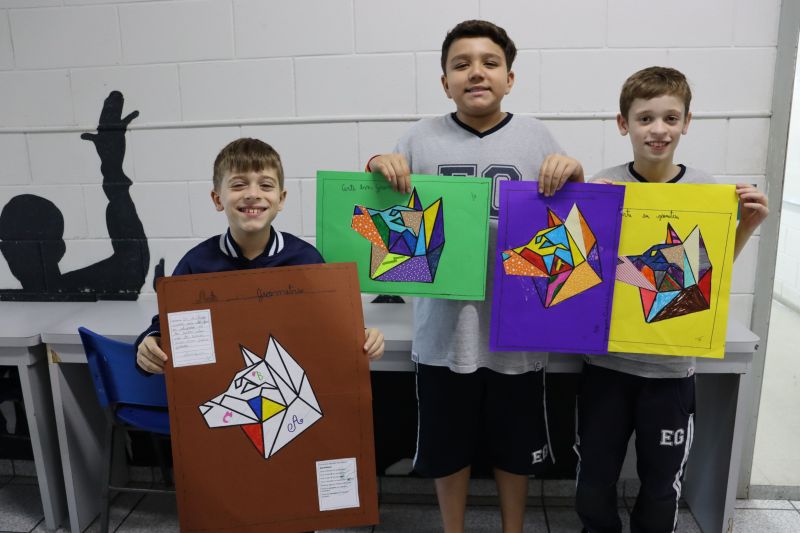 Os estudantes do 5º ano EF, orientados pelas Professoras Tânia e Vitória, fizeram uma atividade baseada nas obras de Romero Brito, juntando arte e matemática.