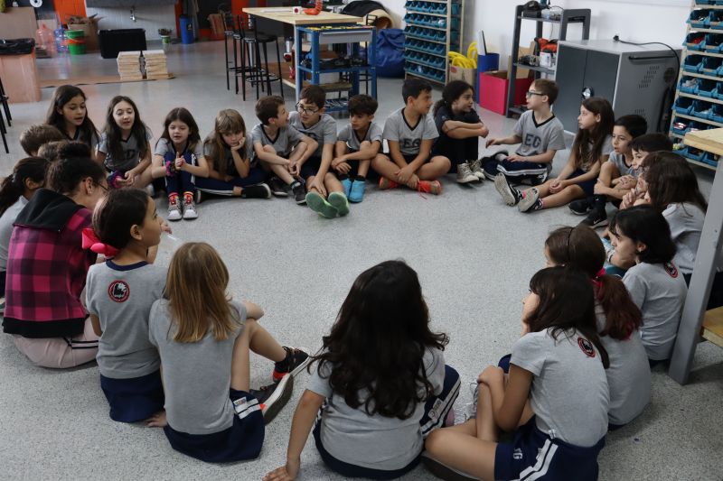 Os estudantes do 3º ano EF foram ao Espaço Maker e, sob orientação da Virgínia e do Nicolas, responsáveis pelo espaço, participaram de uma atividade com o objetivo principal de ampliar aprendizagens sobre medidas de massa, capacidade e comprimento.