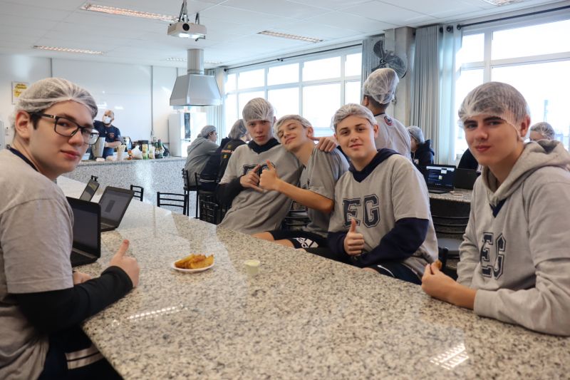 Os estudantes do Itinerário de QuÃmica, da 2ª série do EM – Investigação e Análises QuÃmicas, foram à cozinha experimental e, sob orientação do Professor Alex, de QuÃmica, e do Professor Carlos (responsável pela Cozinha Experimental e pelo Laboratório), participaram de uma deliciosa aula de elaboração de três receitas: batata rústica, maionese verde e milk shake.