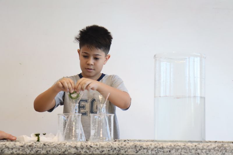 Para comprovar a liberação do gás oxigênio no final do processo da fotossíntese, os alunos do 4º ano, participaram da montagem do experimento utilizando água, bicarbonato de sódio e uma planta aquática.