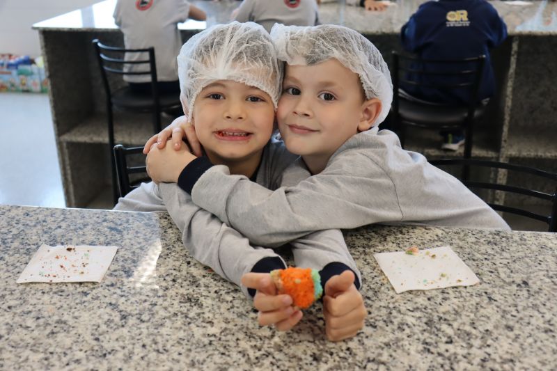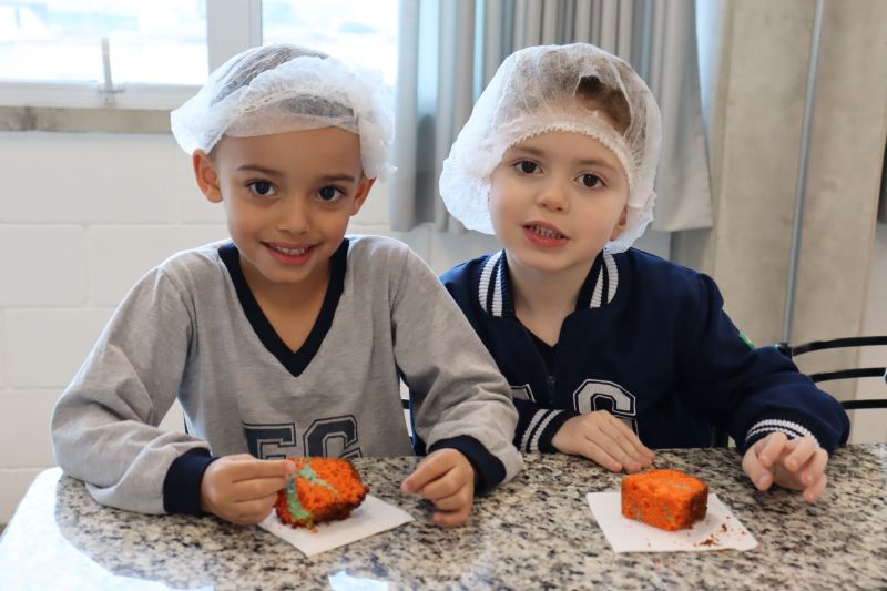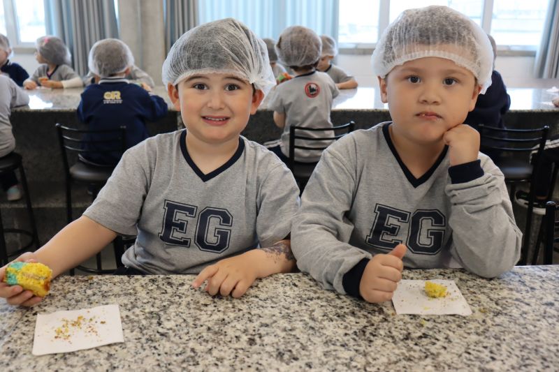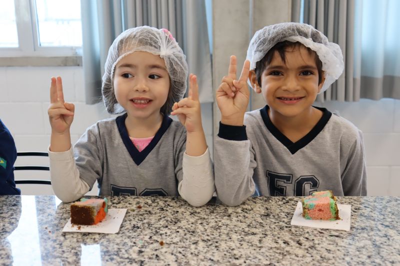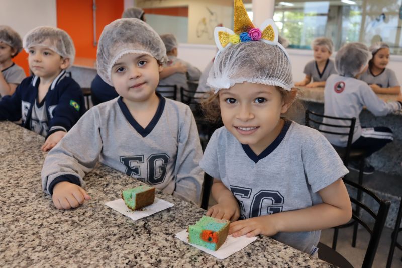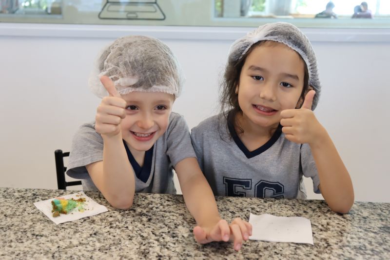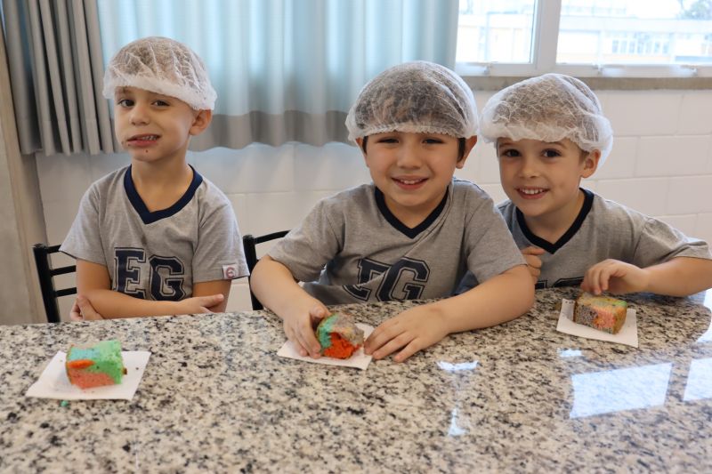 Nossos pequenos estudantes do Nível I A e B foram à Cozinha Experimental acompanhados das Professoras Cida e Luciana, para preparar uma receita de bolo arco-íris, sob a orientação do Prof. Carlos, responsável pela Cozinha Experimental e pelo Laboratório.