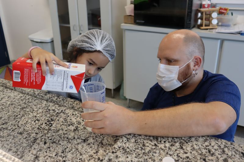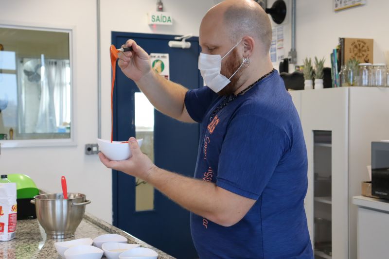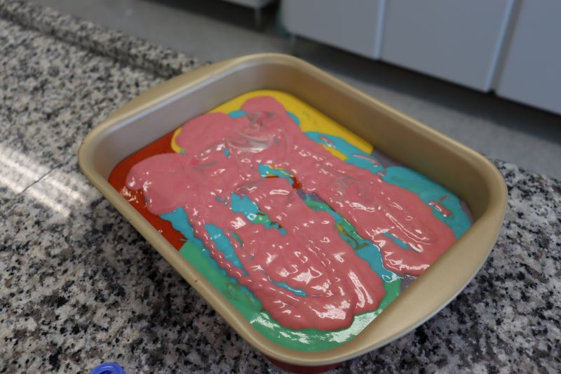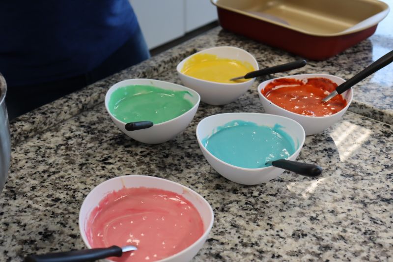 Os alunos o auxiliaram no preparo e na junção das massas coloridas e, ao final, aguardaram ansiosos para ver o resultado do bolo colorido.