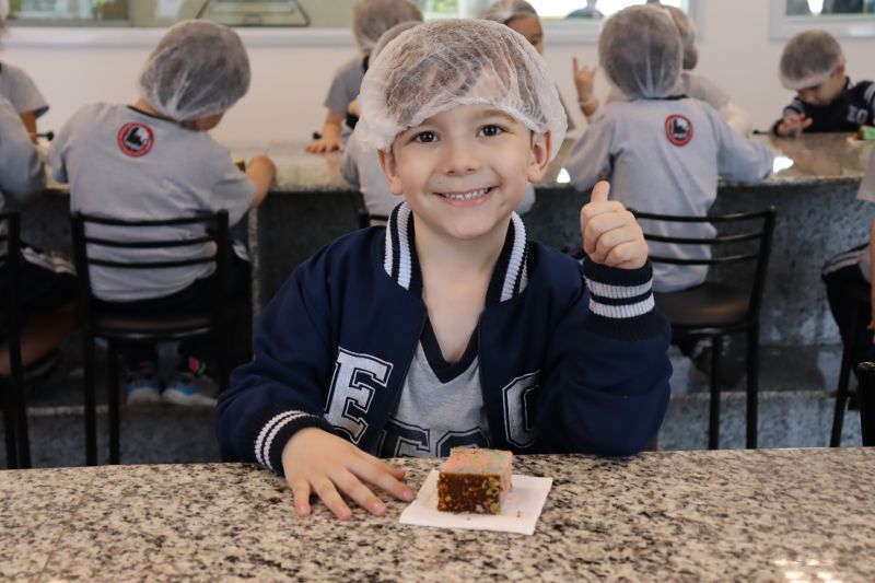 Com o bolo pronto, todos degustaram a deliciosa receita, em um momento de socialização entre as duas turmas.