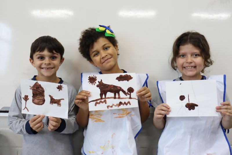 No mês de outubro, os alunos do 1º ano do EF foram convidados pela professora Vitória, de Arte, a reproduzir essas imagens em papel, utilizando desenhos e tintas.