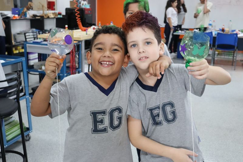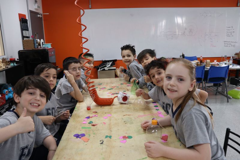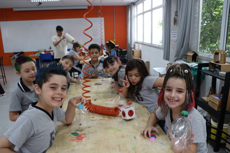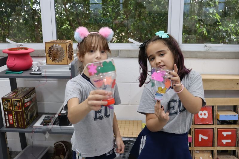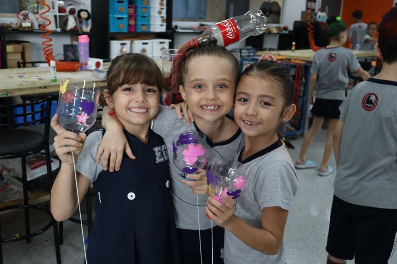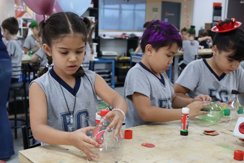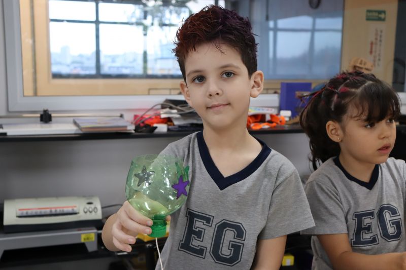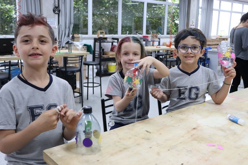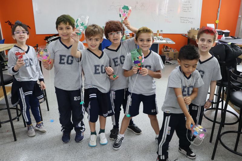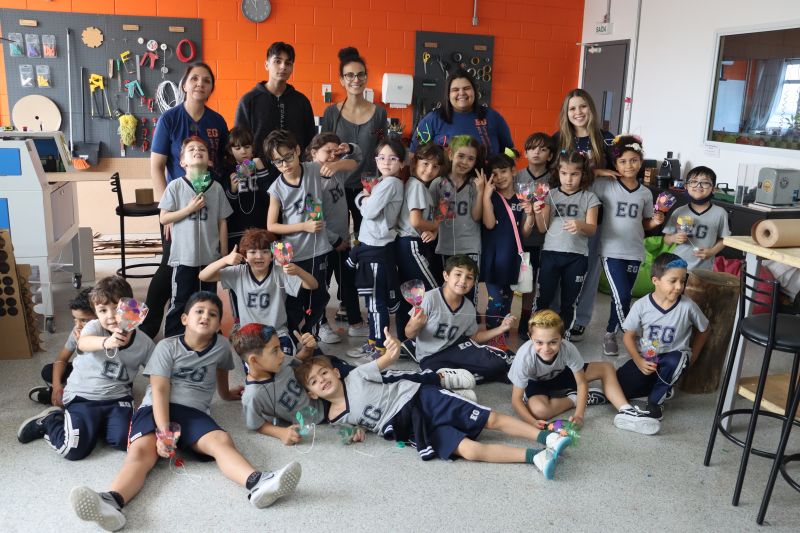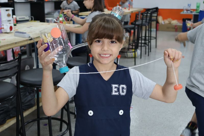Os estudantes do 1º ano do Ensino Fundamental fizeram atividades diferentes em comemoração ao Dia das Crianças. Primeiramente foram ao Espaço Maker e, sob orientação da Virginia (responsável pelo espaço) confeccionaram um bilboquê e se divertiram com o brinquedo.