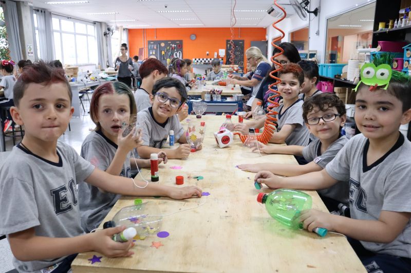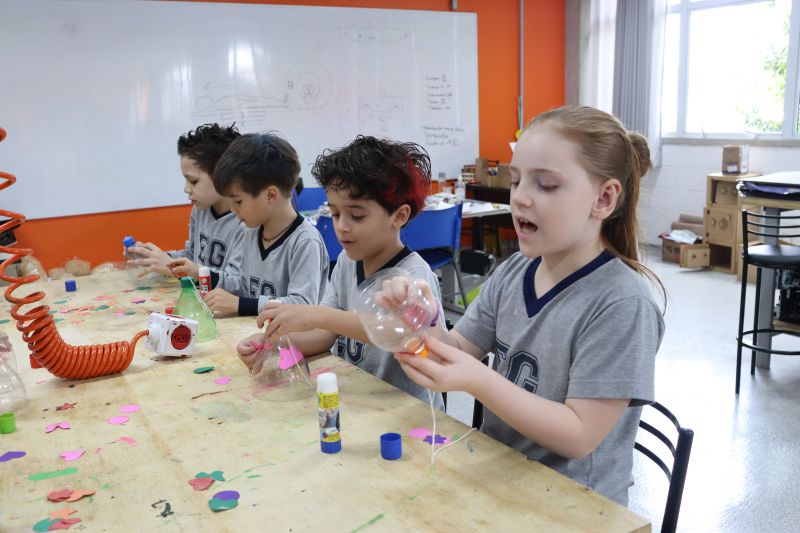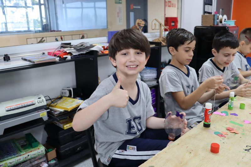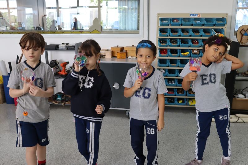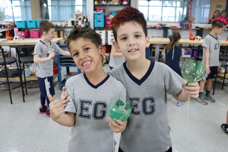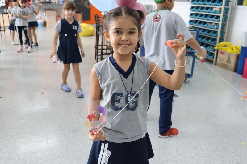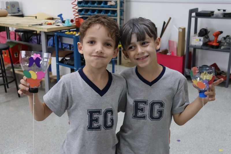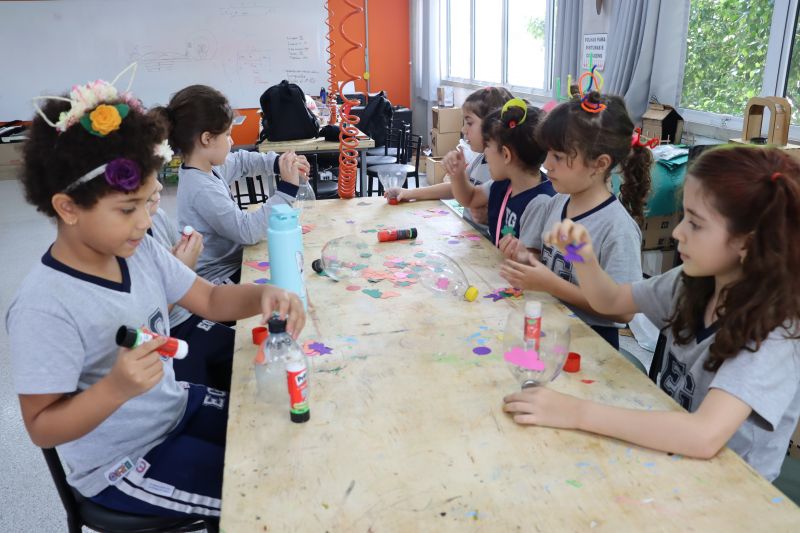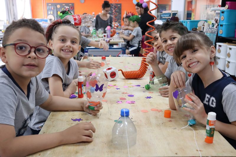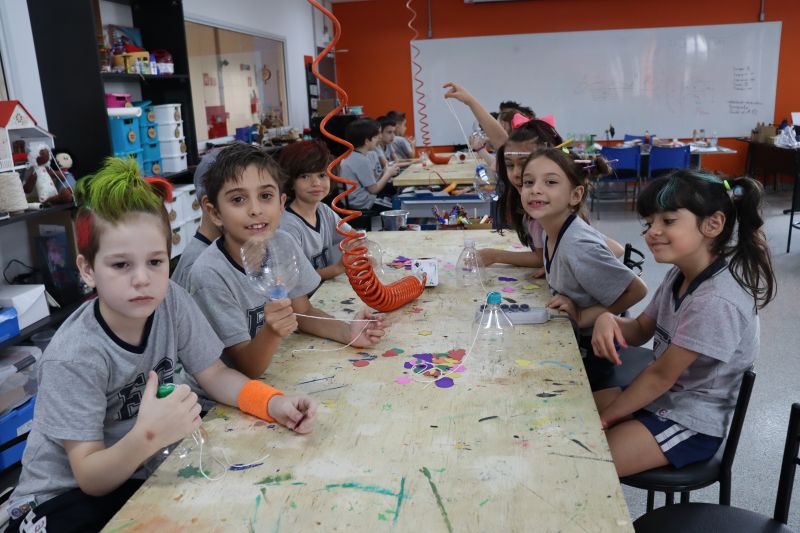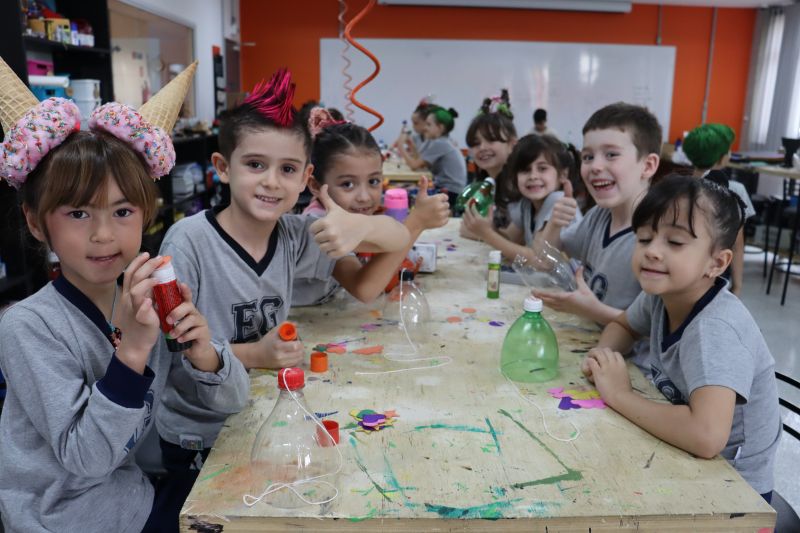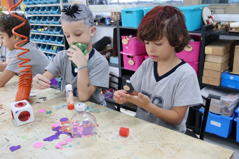 Os estudantes do 1º ano do Ensino Fundamental fizeram atividades diferentes em comemoração ao Dia das Crianças. Primeiramente foram ao Espaço Maker e, sob orientação da Virginia (responsável pelo espaço) confeccionaram um bilboquê e se divertiram com o brinquedo.