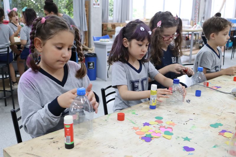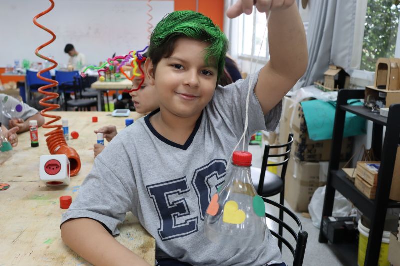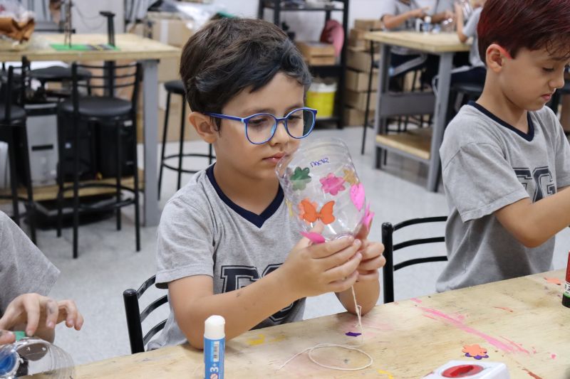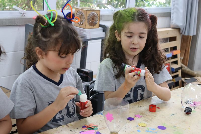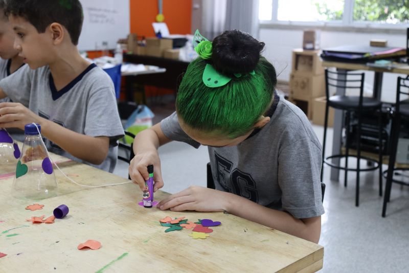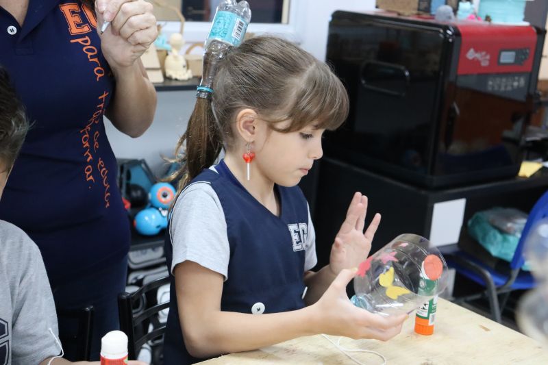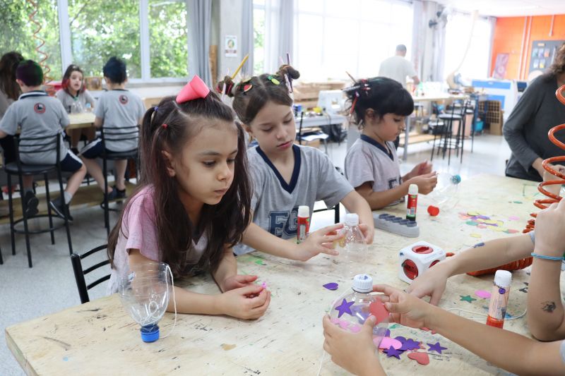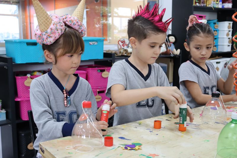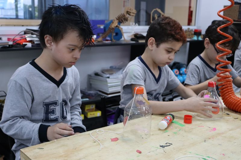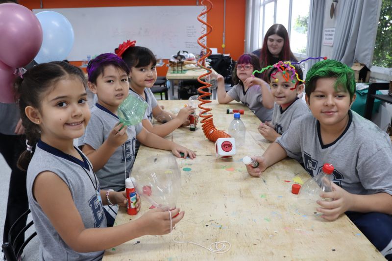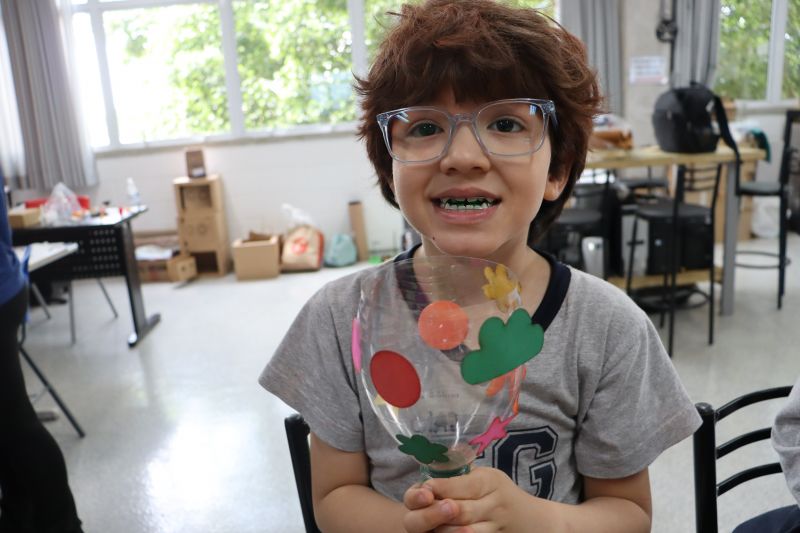 Os estudantes do 1º ano do Ensino Fundamental fizeram atividades diferentes em comemoração ao Dia das Crianças. Primeiramente foram ao Espaço Maker e, sob orientação da Virginia (responsável pelo espaço) confeccionaram um bilboquê e se divertiram com o brinquedo.