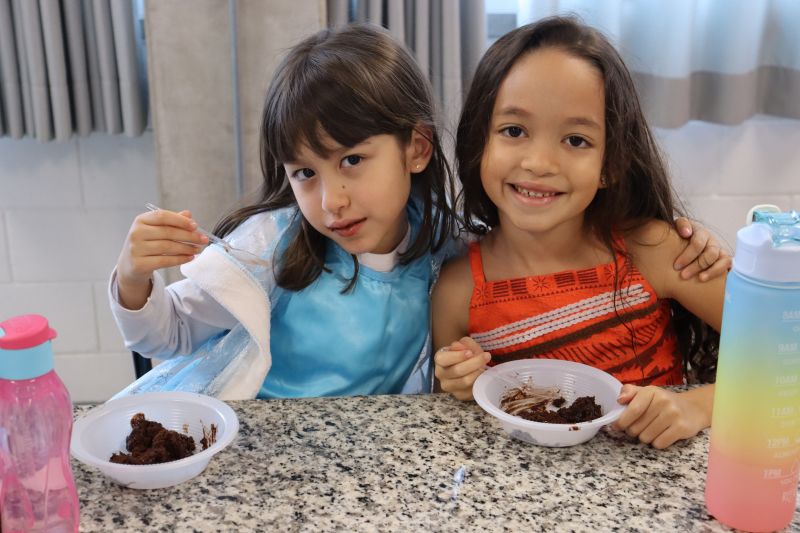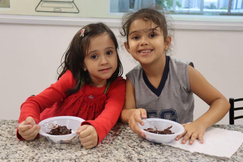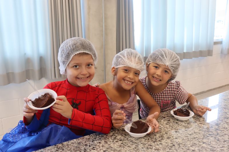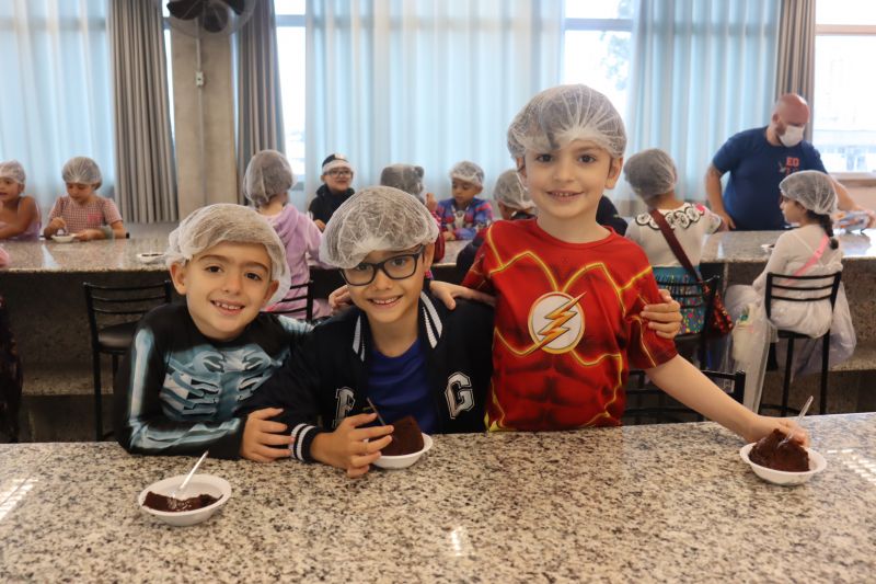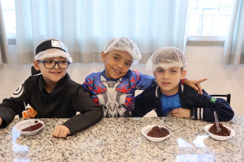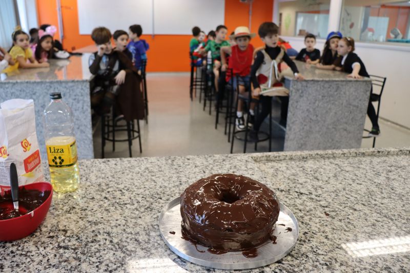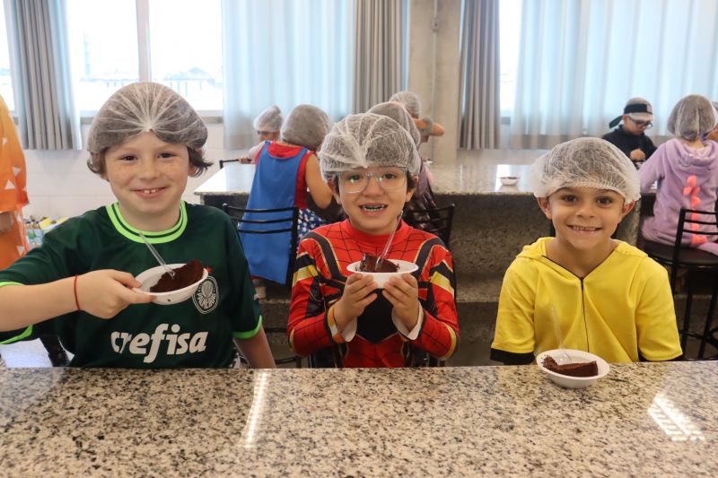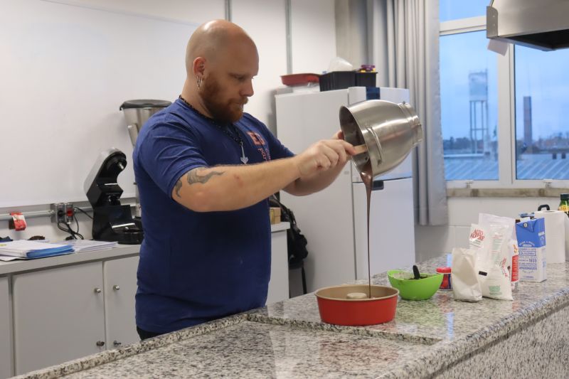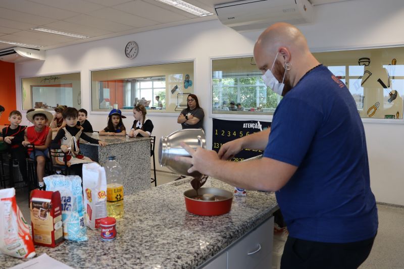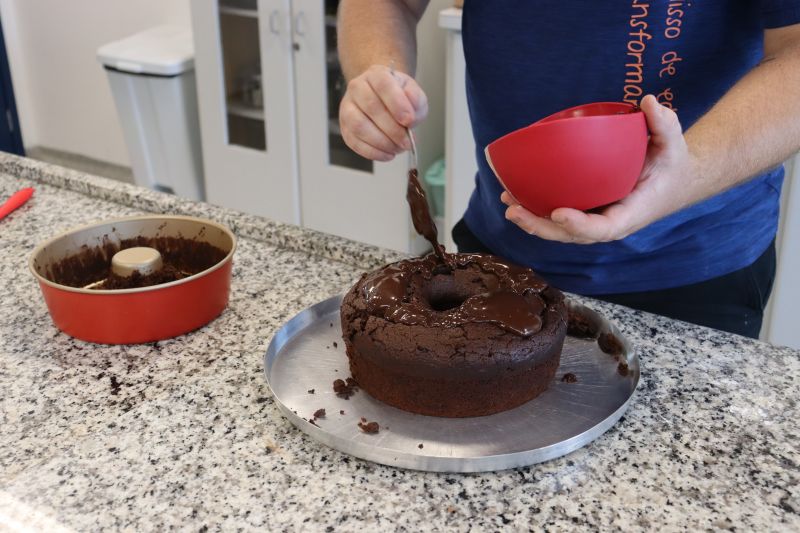 E em outro dia, foram à Cozinha Experimental e, sob orientação do Prof. Carlos, responsável pela Cozinha Experimental e pelo Laboratório, auxiliaram no preparo de um delicioso bolo de chocolate com cobertura de ganache, degustado em seguida...