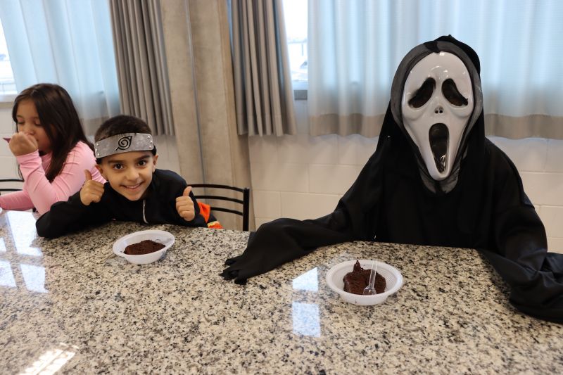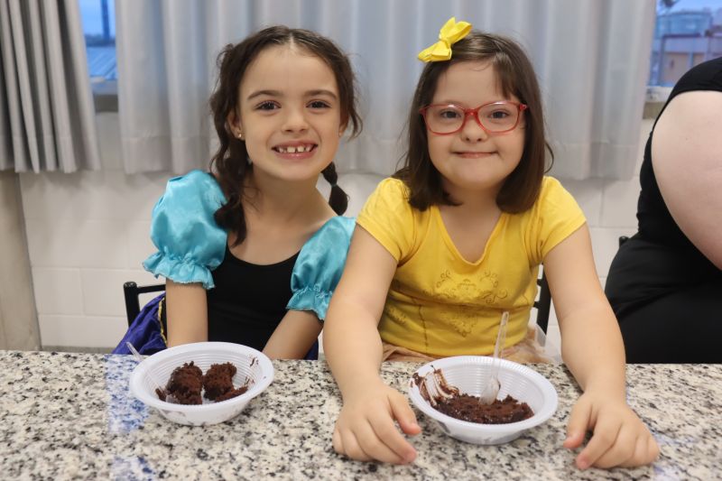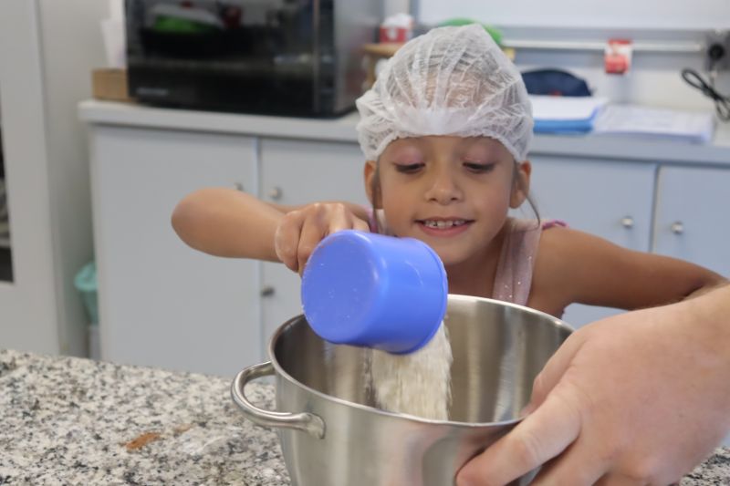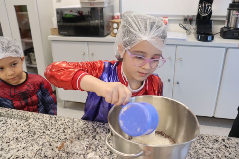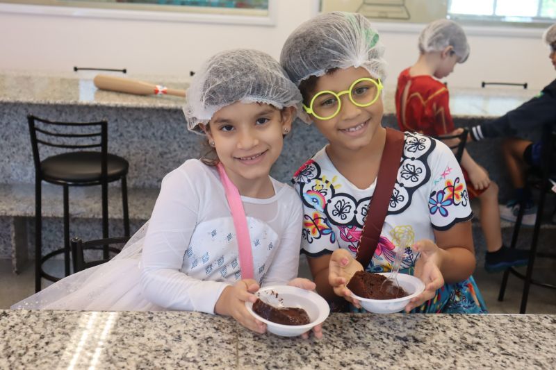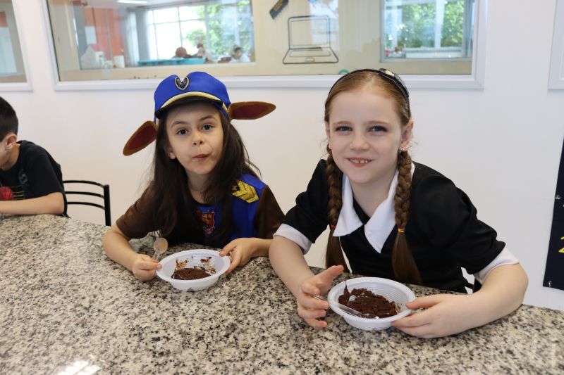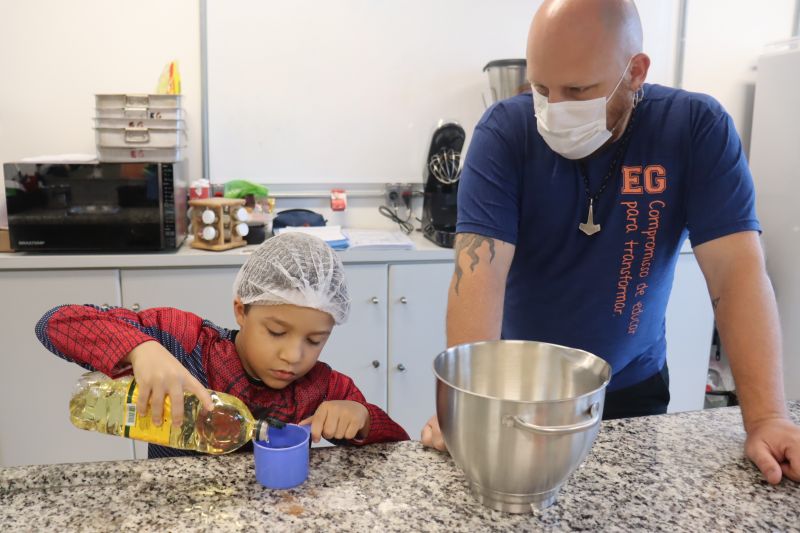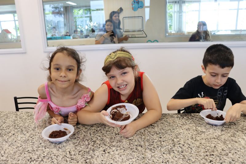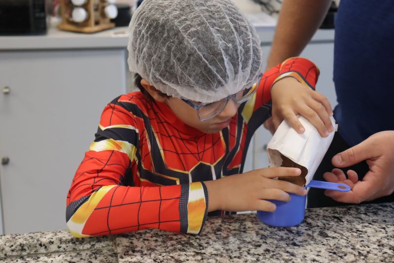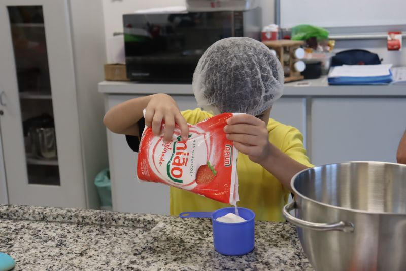 E em outro dia, foram à Cozinha Experimental e, sob orientação do Prof. Carlos, responsável pela Cozinha Experimental e pelo Laboratório, auxiliaram no preparo de um delicioso bolo de chocolate com cobertura de ganache, degustado em seguida...