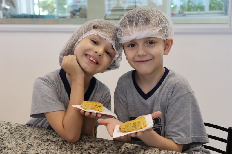 Os estudantes do 2º ano EF foram à cozinha experimental, sob orientação das Professoras Juliana, Leila, Maria Cristina e Sheila e do Professor Carlos, responsável pelo espaço, onde prepararam a receita de uma torta salgada vegetariana.