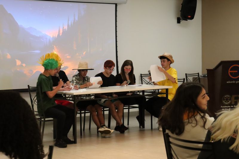 Os estudantes do Itinerário de Humanas, de 1ª e 2ª séries do EM, foram ao salão nobre e, sob orientação dos Professores Danilo (Oficina de Literatura), Diego (Análises Historiográficas), Raquel (Observatório Geográfico) e Thais Amaral (Criação e estudo em Artes), criaram, em grupos, peças teatrais.