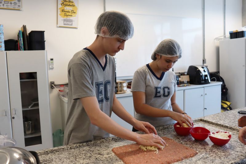 Os estudantes do Itinerário de Química, da 2ª série do EM – Investigação e Análises Químicas, foram a cozinha experimental, sob a orientação do Professor Alex, de Química, e do Professor Carlos, responsável pelo espaço, onde fizeram um rocambole de carne e rocambole de carne de soja.