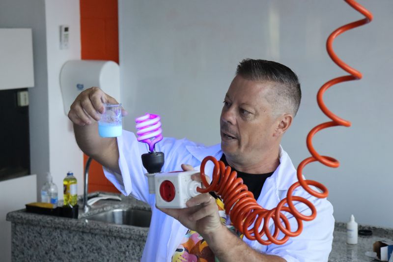 Para realizar o experimento, foi utilizada luz negra, material interno das pulseiras fluorescentes, água oxigenada e ácido oxálico.